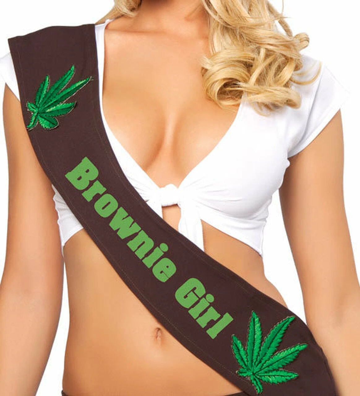 Make an ultra fresh and modern sexy fashion forward statement in this awesome Colorado Brownie Girl Costume. 4 piece cannabis themed Brownie costume includes pleated sexy pleated short skirt with cannabis green detail at hem, tie front crop top, bold brown sash with sewn on cannabis patches, and jaunty relaxed look white beret with happy face and marijuana leaf patch at cap front. Cannabis culture will salute your sexy pride!