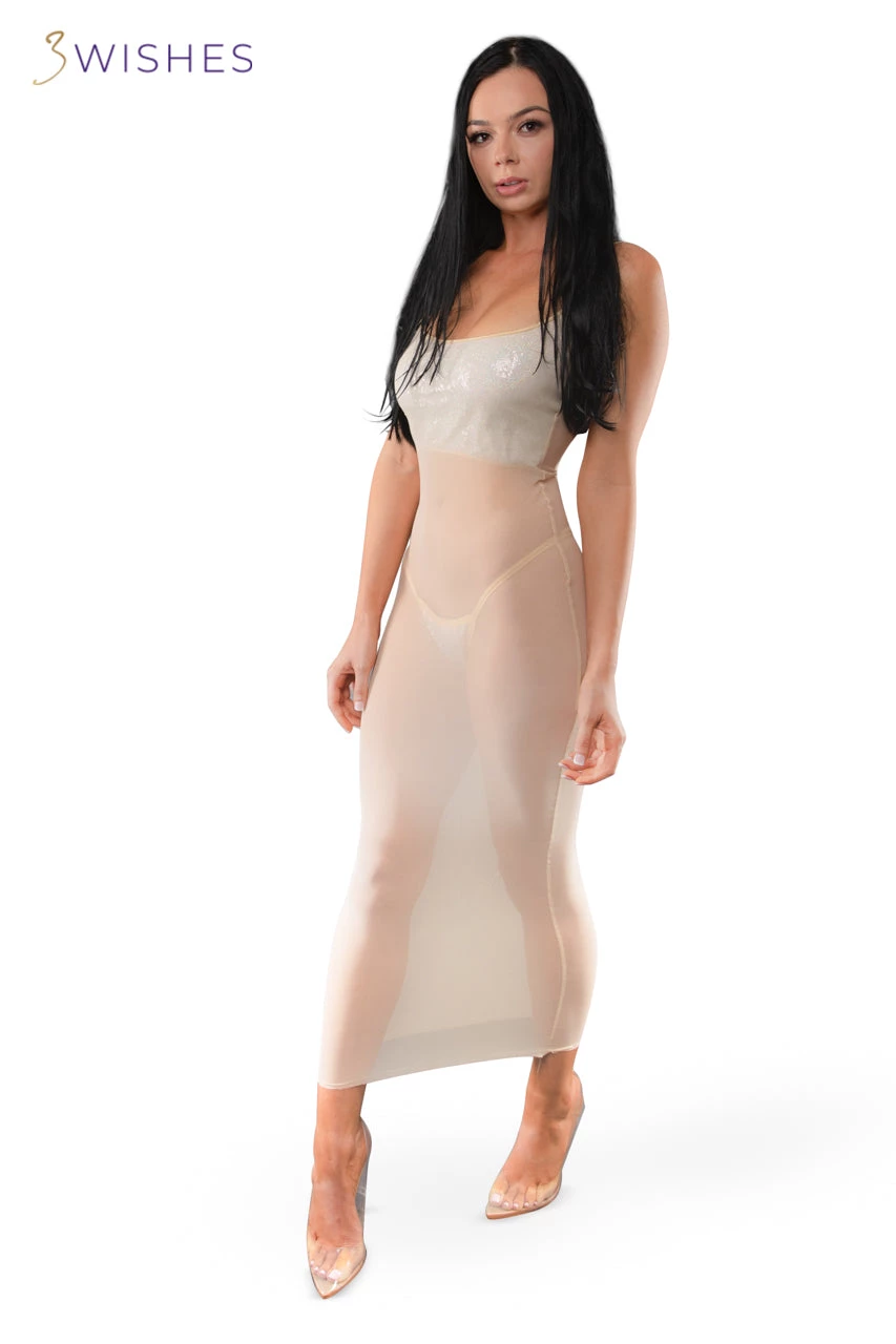 Show some skin and be just the right amount of extra this Halloween in this Foxy Nude Award Show costume. This costume includes a slinky, long nude mesh dress with a glitter bust and a matching glitter g-string panty. Pair it with our Rad Red Rapper costume and you’re sure to make the Halloween paparazzi go crazy.