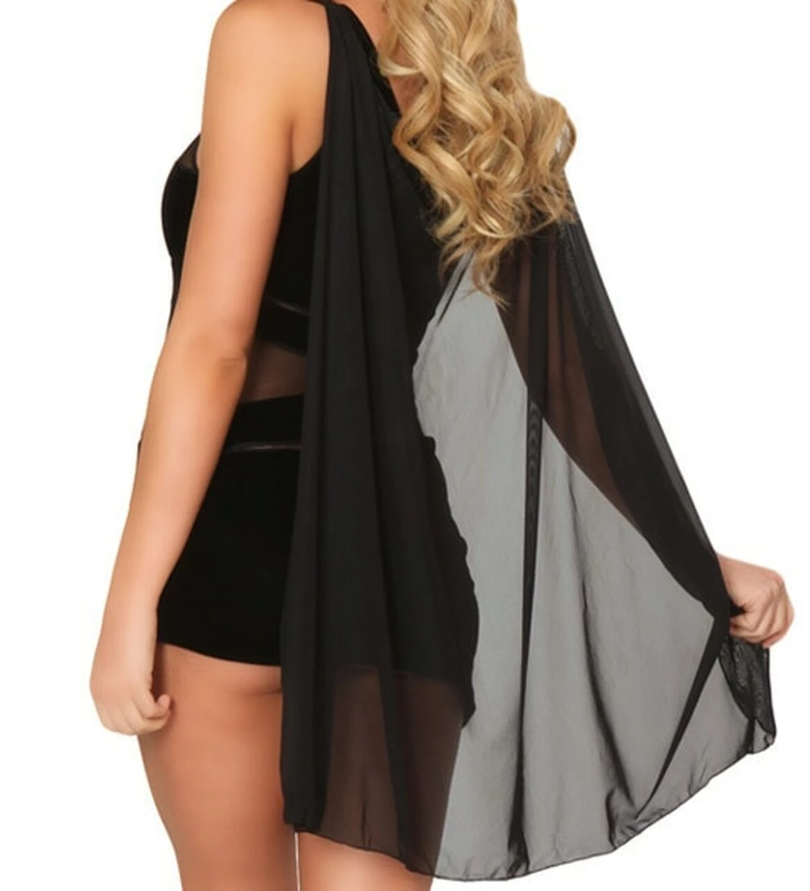 Three Piece Rhiannon Witch Costume includes Asymmetrical Faux Velvet/Mesh Dress with Button-on Removable Mesh Cape, and Wired Witch Hat.Â