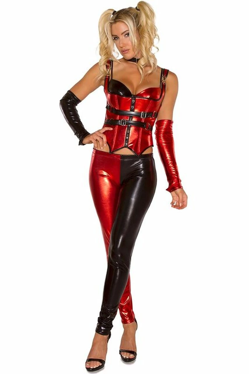 Sexy, sleek and amazing!! You will have jaws dropping and you’ll be feeling amazing while you’re in this sexy Harlie costume. It is made to fit like a glove and to hug every vivacious curve you have. This sexy villian costume consists of six pieces. Those pieces included are: an underwire bra that has Hook N Eye back closure as well as adjustable straps, a lace-up back corset that has faux leather adjustable buckles, shoulder straps that are adjustable, boning, and a Hook N Eye side closure! You will be the best dressed in any room you walk into with this costume on!