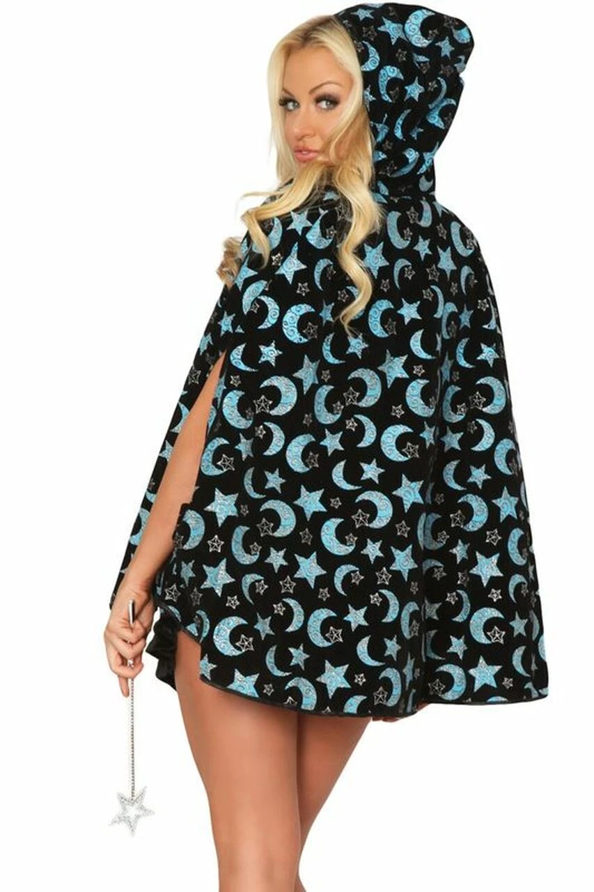 Four Piece Sorcery School Girl Costume includes Hooded Velvet Cloak with Glitter Moon and Star Details, Stretch Velvet Top with Rhinestone Embellishments and Faux Front Tie, Matching Mini Skirt with Attached Belt with Rhinestone Star Buckle, and Wand.Â
