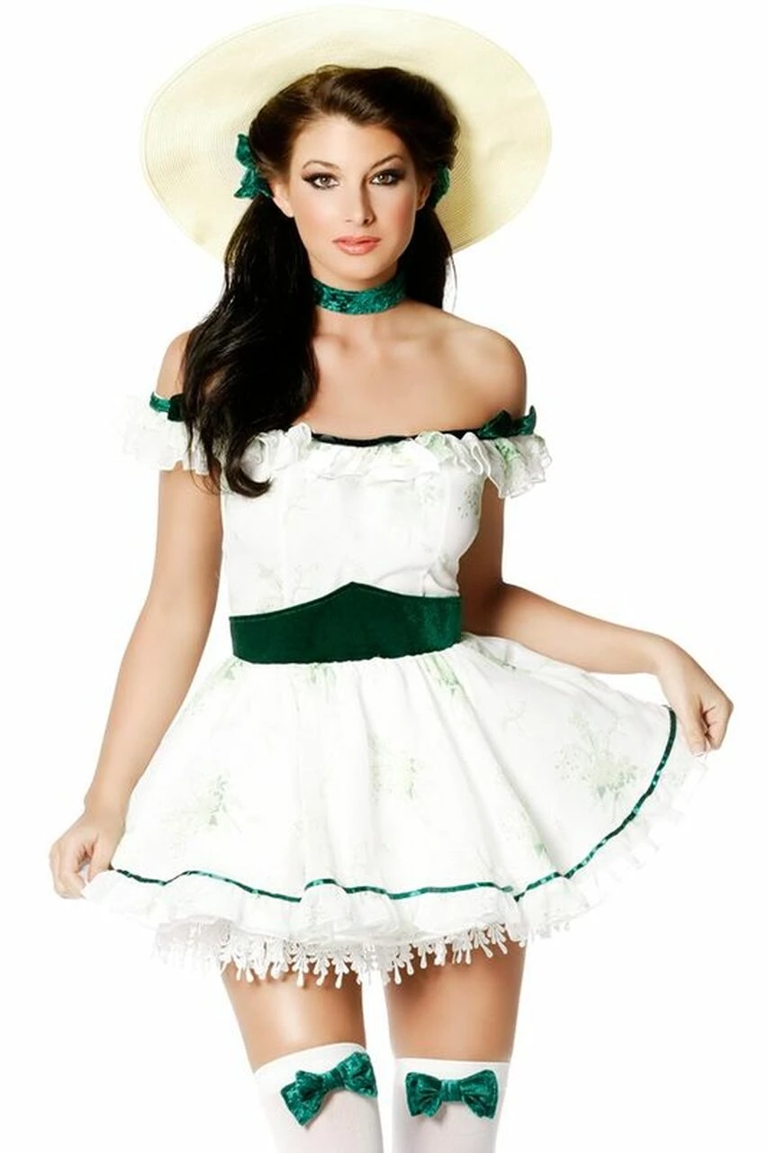 Have you ever wished you could be a gorgeous and sexy Southern belle, even if just for a day? Well, with this sexy and sultry gone with wind style costume, you can do just that. This 4 piece Sexy Scarlett Costume comes with a white mini-dress with emerald floral details and an attached crushed velvet emerald belt detail and off-the-shoulder sleeves. You will also get emerald green hair bows and a matching choker as well as seductive white mid-thigh stockings with emerald green bow details at the top. All you will need to complete the ensemble is a dashing Southern Gent on your arm.