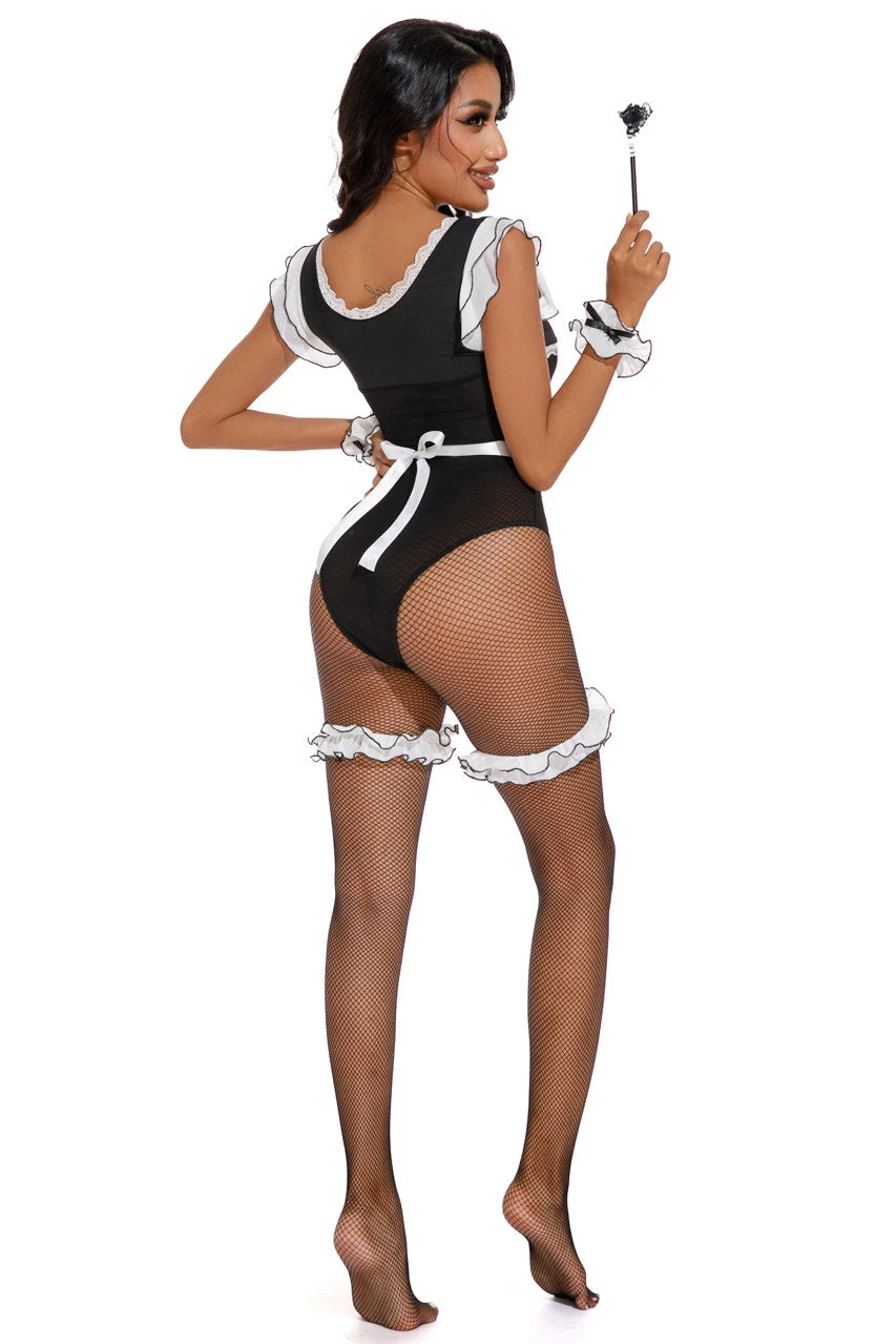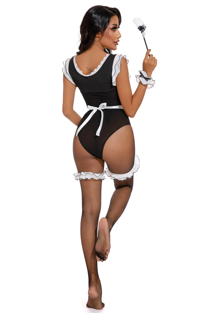 This six-piece, Mischievous Miss Maid costume includes a black bodysuit with sheer mesh details, a tie back apron, arm cuffs, leg garters, fishnet pantyhose, and a feather duster.