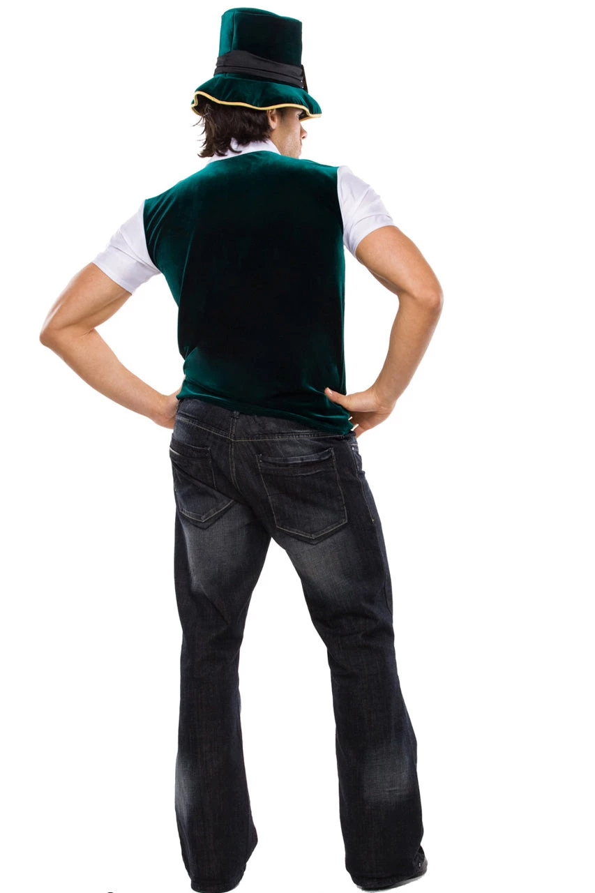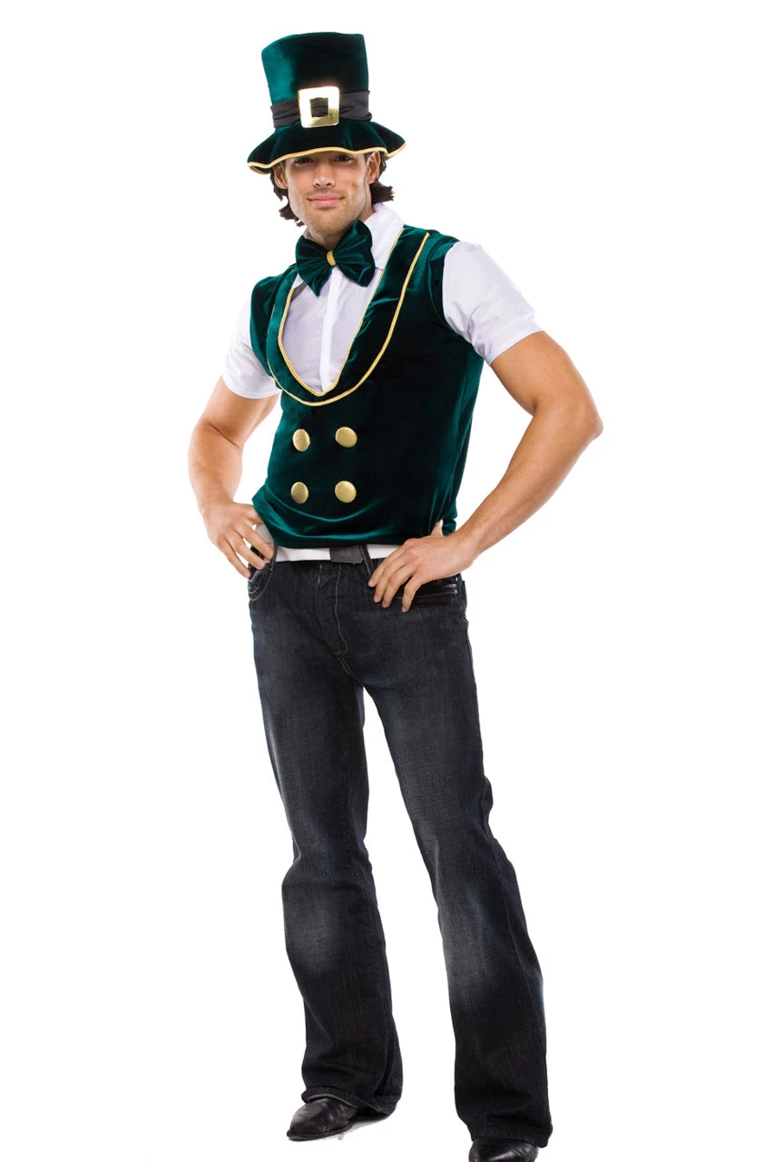 This Men’s Leprechaun costume includes a green velvet vest with an attached white shirt, gold button and trim detail, bow tie, and hat.