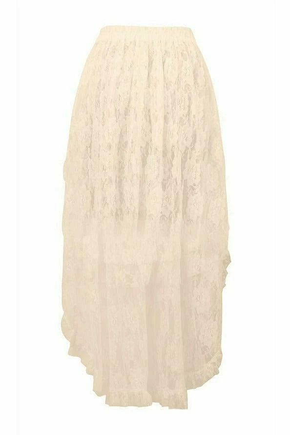 Our Ivory Lace Hi-Low Skirt is a modern-day take on the classic v-skirt silhouette. The unique fabric creates an interesting and unexpected design that is sure to stand out. With elastic waistband, this skirt will flatter nearly any figure.