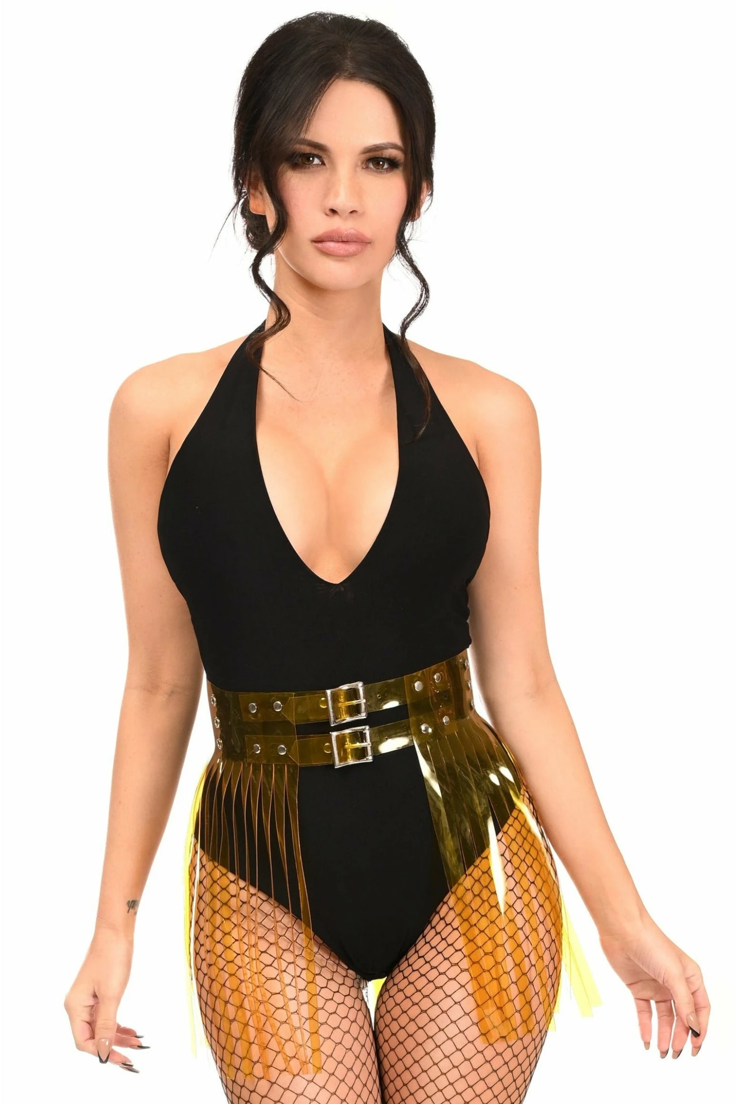 This Yellow Clear Fringe Skirt is one of a kind! This unique skirt features clear plastic fabric and silver metal hardware. The waist of this skirt is adjustable for a perfect fit.Â