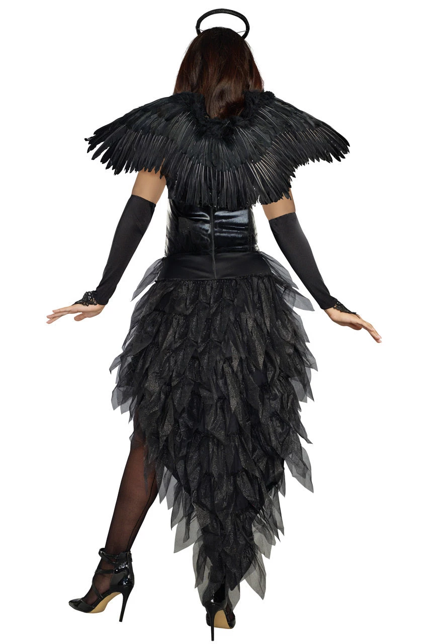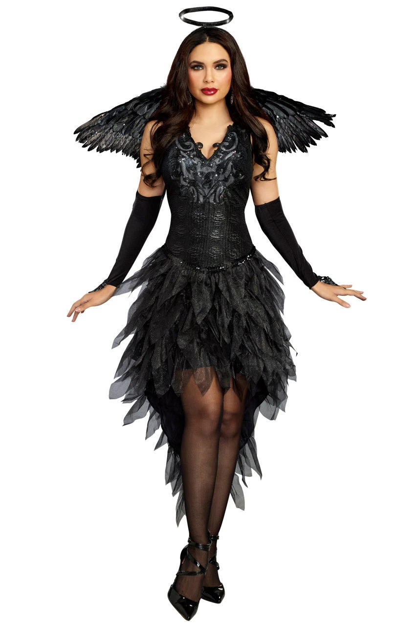 This Angel of Darkness costume features a black mini dress with a ruffled, high/low skirted bottom, embroidered bust, black halo and black feather wings. (Gloves and stockings not included.)
