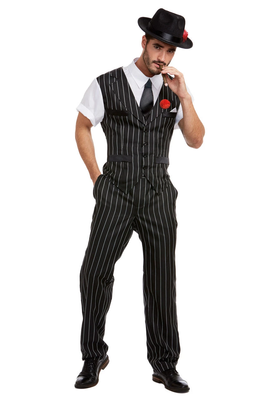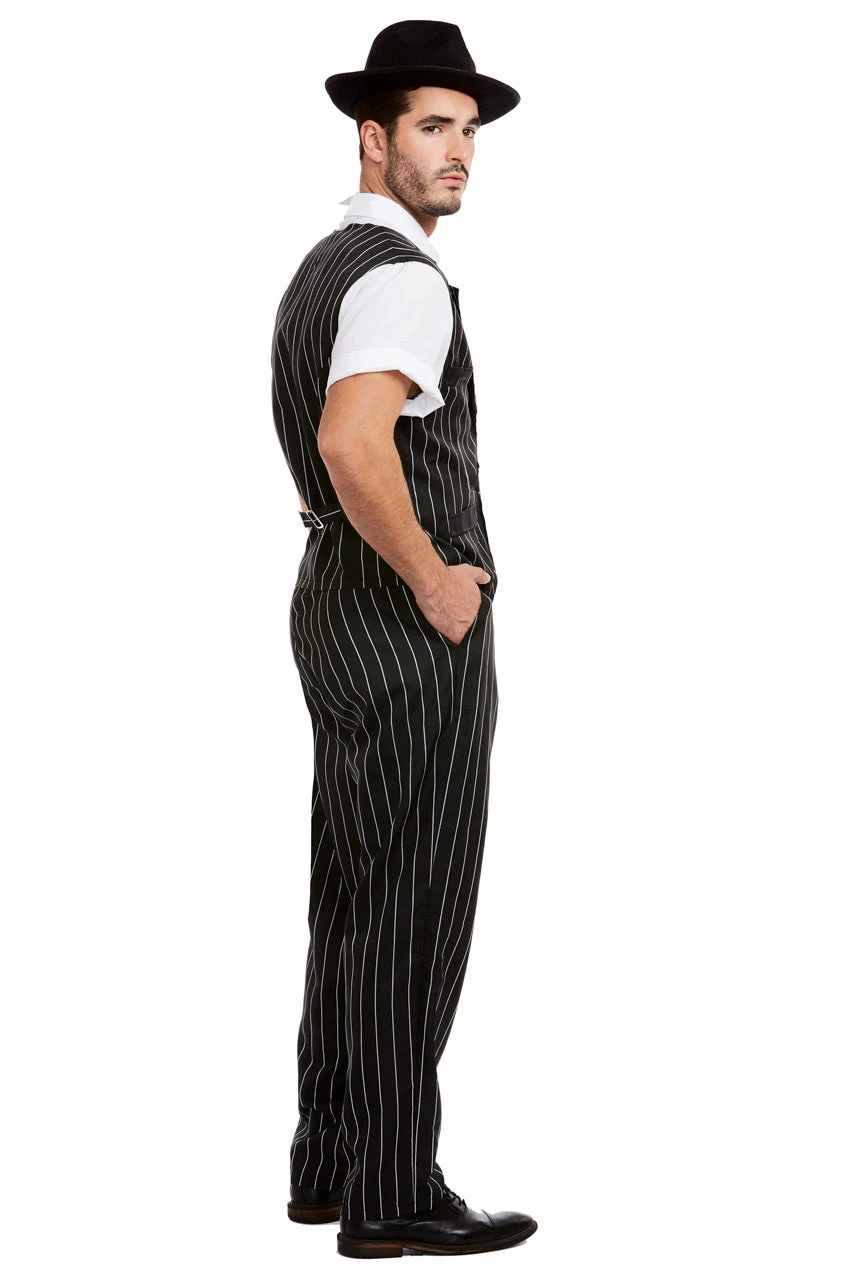 This men’s Bada-Boom! costume features a pinstripe vest with attached white sleeves, adicky with attached tie, pinstripe pants, carnation pin and hat.