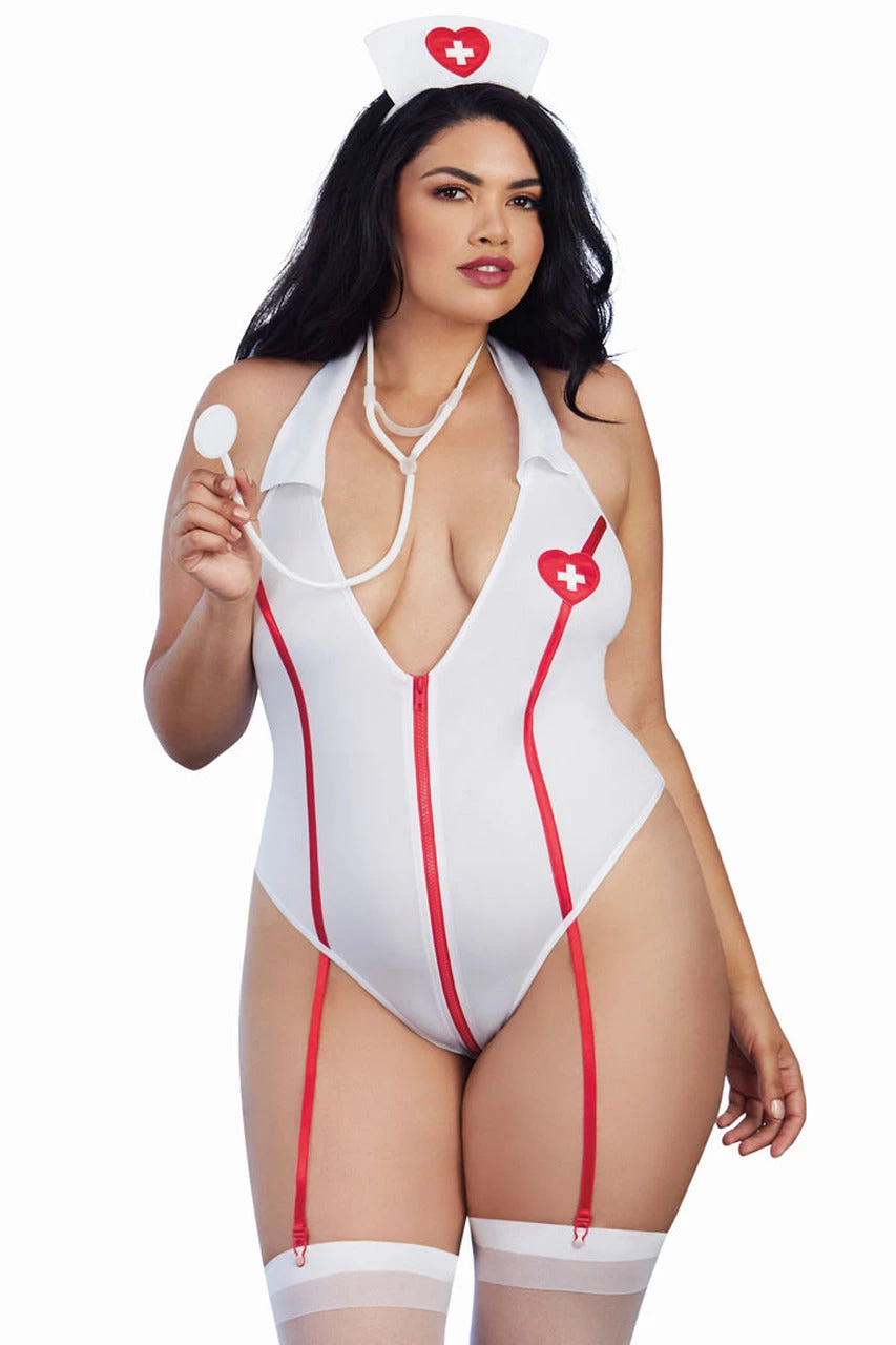 The perfect caretaker, this Care Cutie Sexy Nurse Lingerie Teddy features a sexy nurse outfit with stretch knit teddy, halter neckline with collar neck ties, functioning zipper that zips from front to back, thong cut rear, attached elastic garters, matching nurse’s cap, and toy stethoscope.