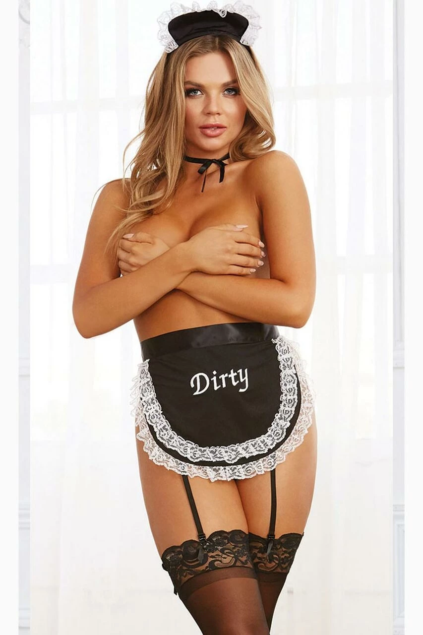 This French Maid Fantasy lingerie costume includes a black teddy with ruffled white trim, apron with “Dirty” print, attached garter straps, an open crotch, maid cap and a ribbon neck choker. (Stockings not included.)