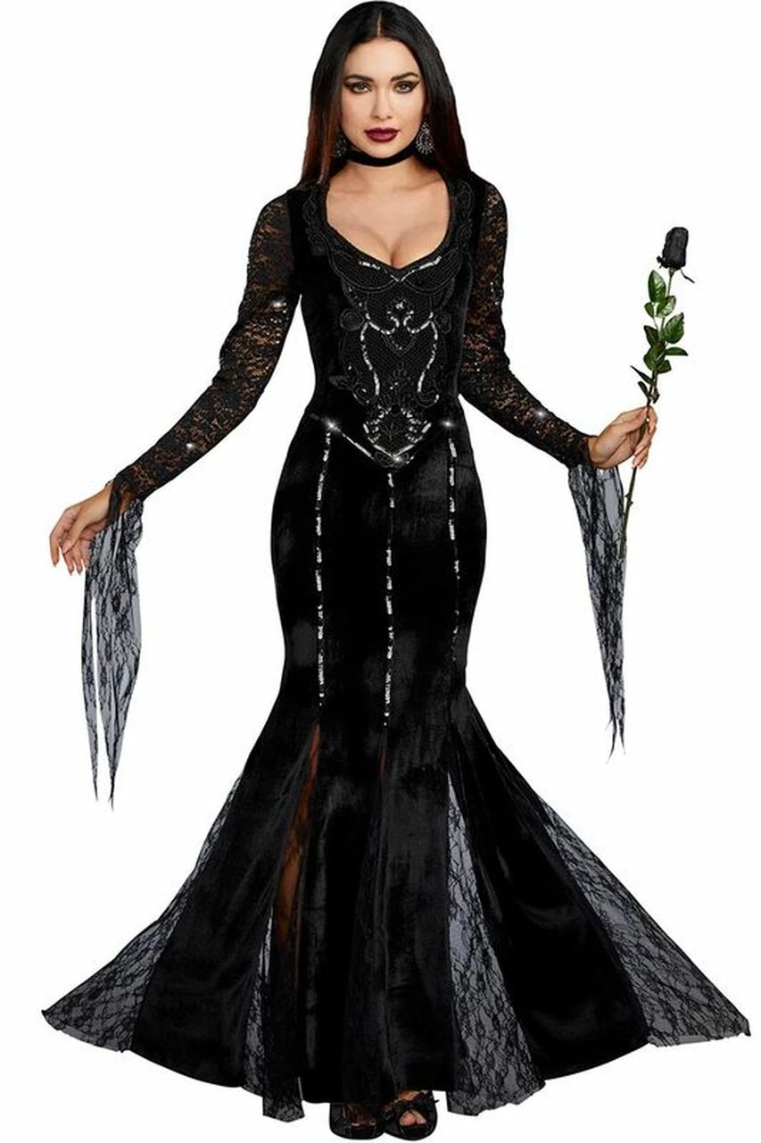 Be the queen of the night in this Frightfully Beautiful costume featuring a long black gown with long sleeves, sheer mesh mermaid skirt bottom, intricate piping and a low cut bust. (Rose not included.)