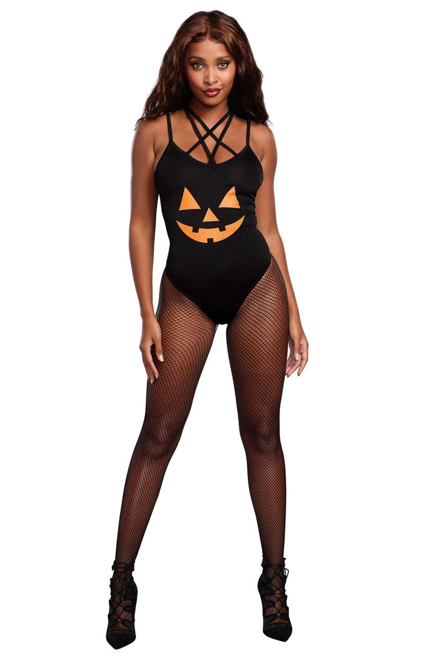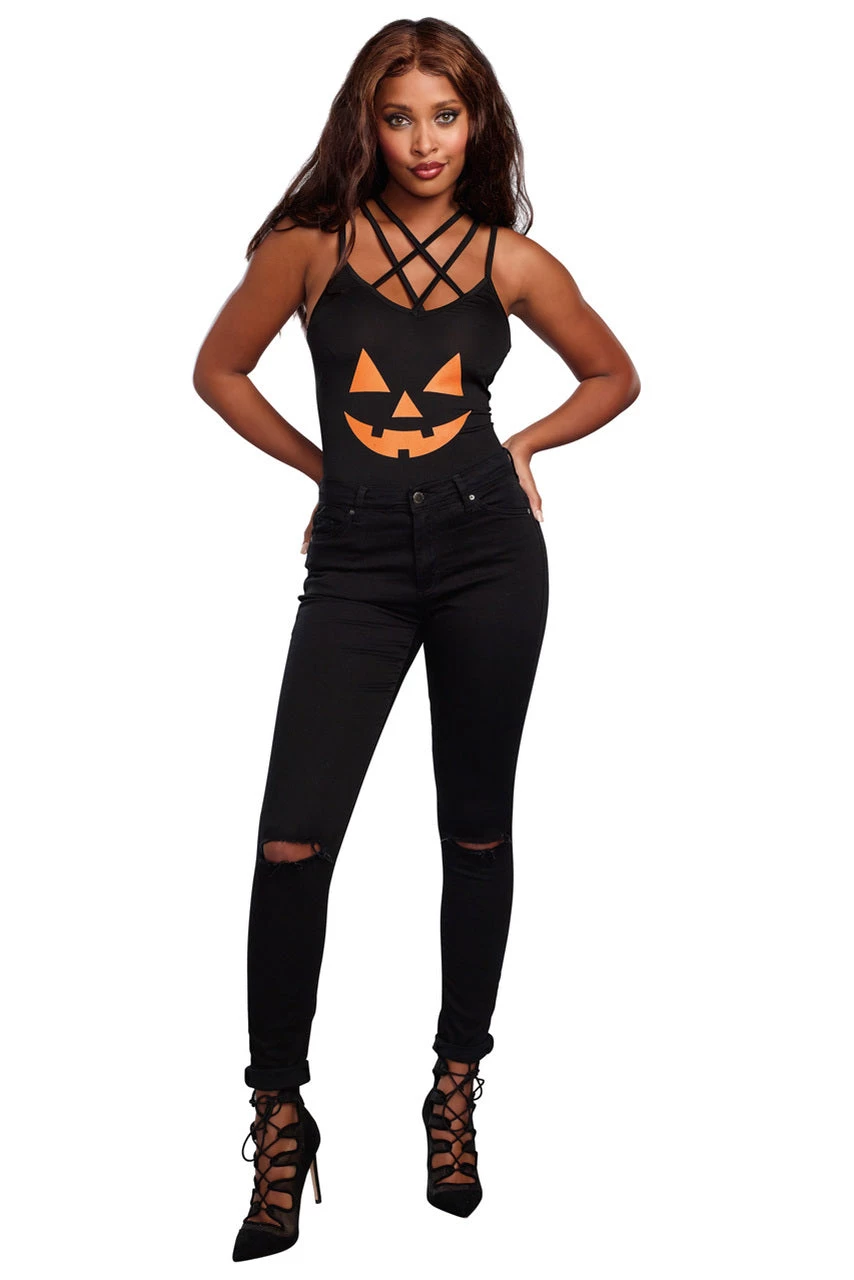 This glow in the dark black bodysuit features an orange, glow in the dark pumpkin print and a strappy neckline.