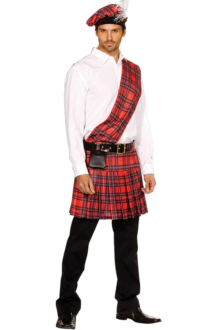This Men’s Hot Scottie costume features a red gingham print pleated kilt, attached sash, a belt with bag, sock garters and a hat.