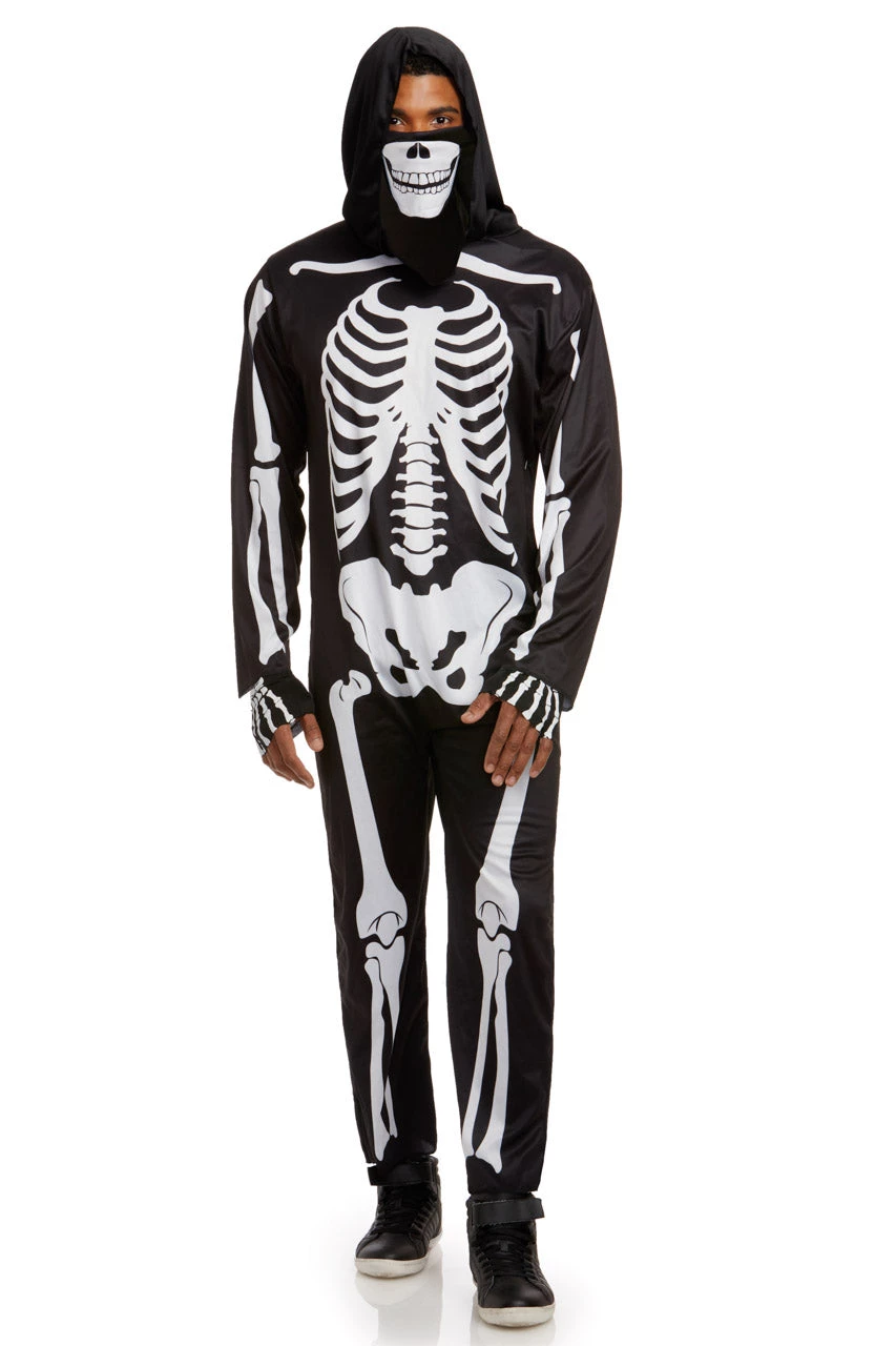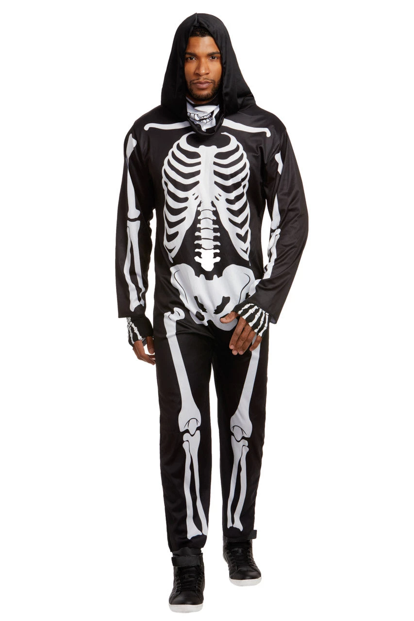 This Mr. Boneyard costume includes a black, skeleton print jumpsuit with an attached hood, skeleton mask, and skeleton print gloves.