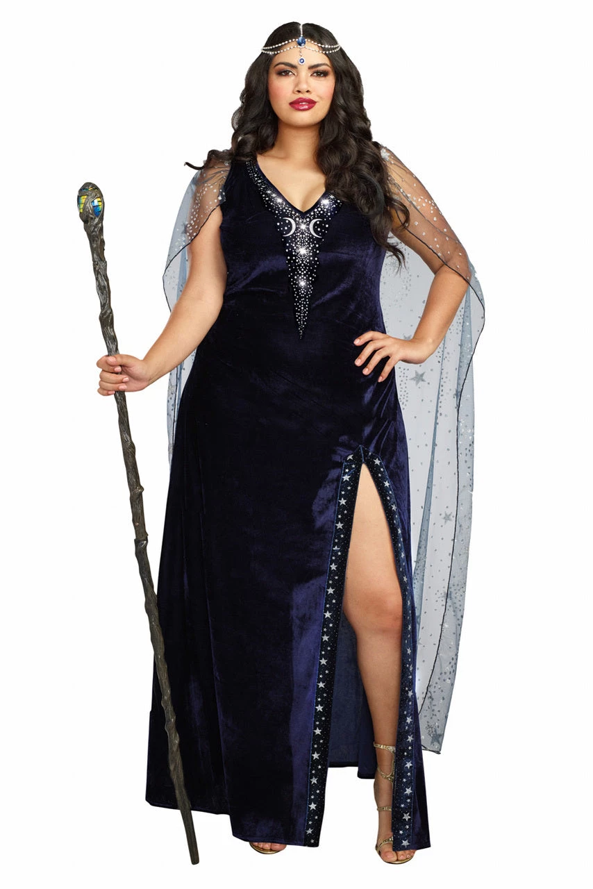 Cast a spell in this Plus Size The Sorceress costume featuring a long black gown with a high side slit, silver sparkle details, an attached black mesh cape and a matching headpiece. (Staff not included.)
