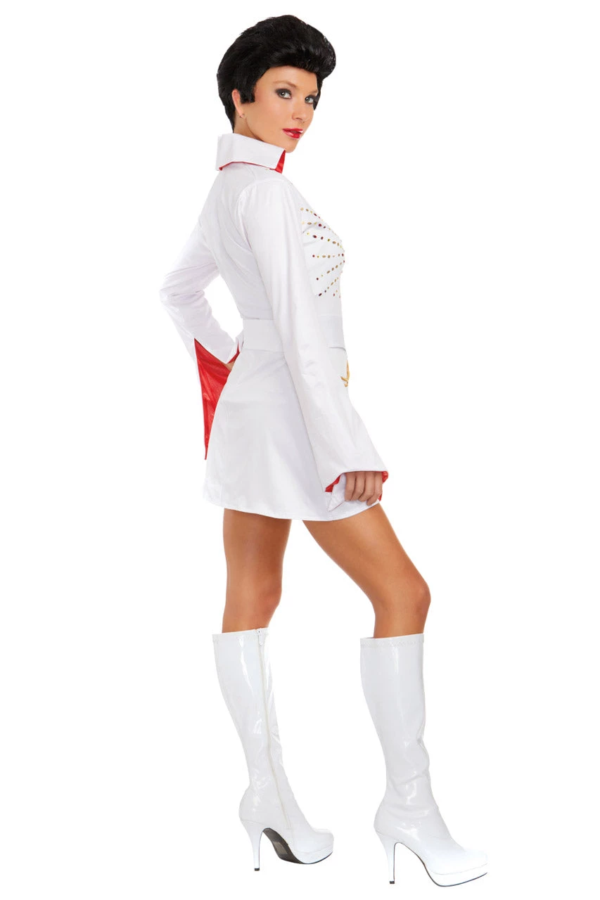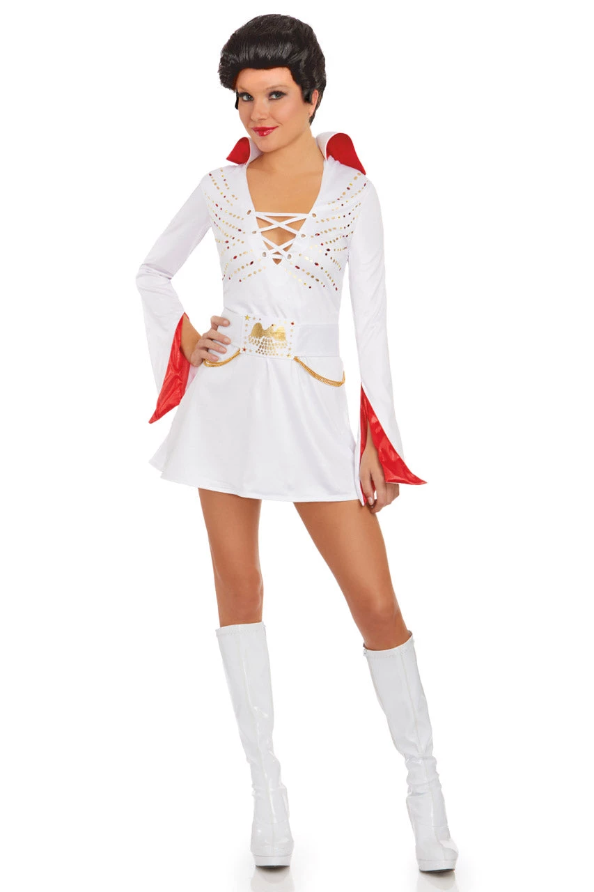 This Queen of Rock costume includes a white mini dress with long sleeves, red satin trim, attached collar, studded details, a low cut lace-up bust, and a matching belt. (Wig not included.)