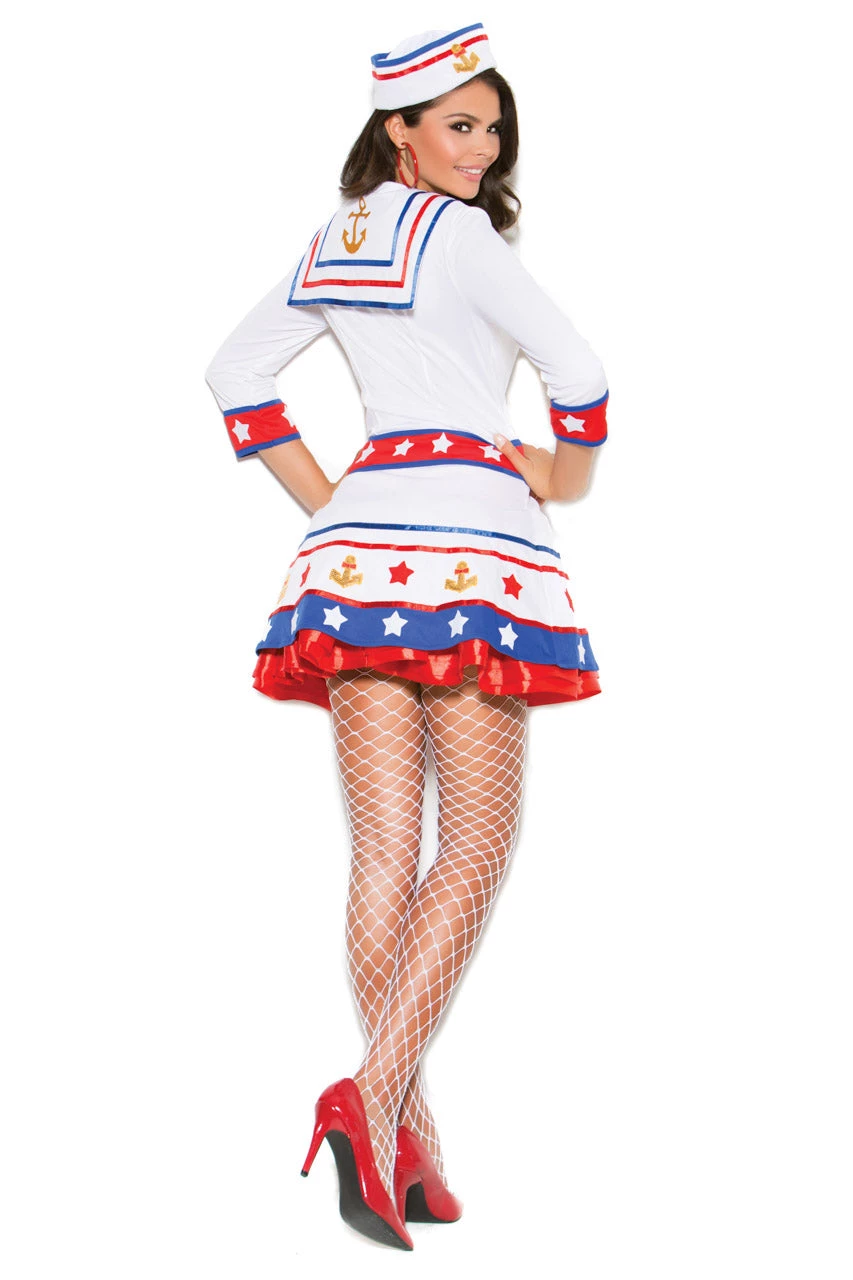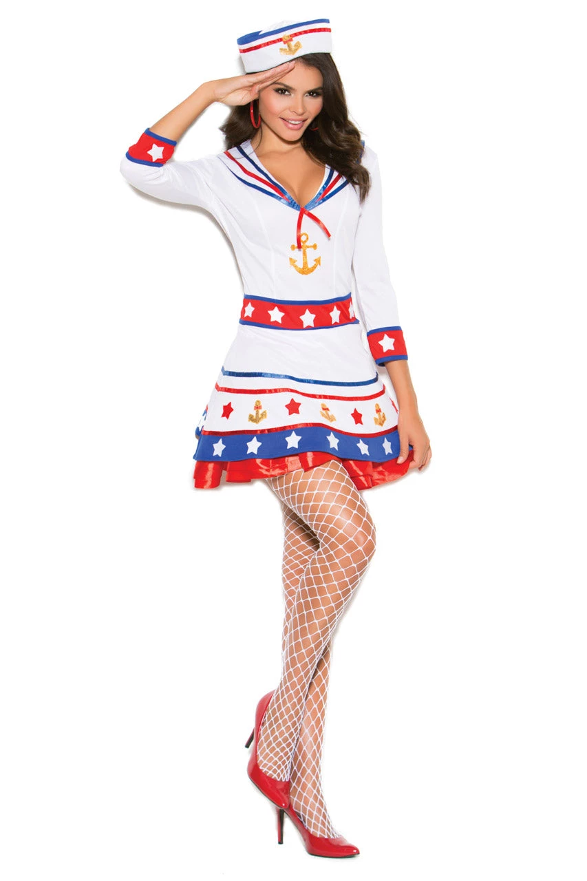 This Harbor Hottie costume includes a white sailor dress with long sleeves, red, white, and blueprint details, gold anchor appliques, and matching hat. (Stockings not included.)