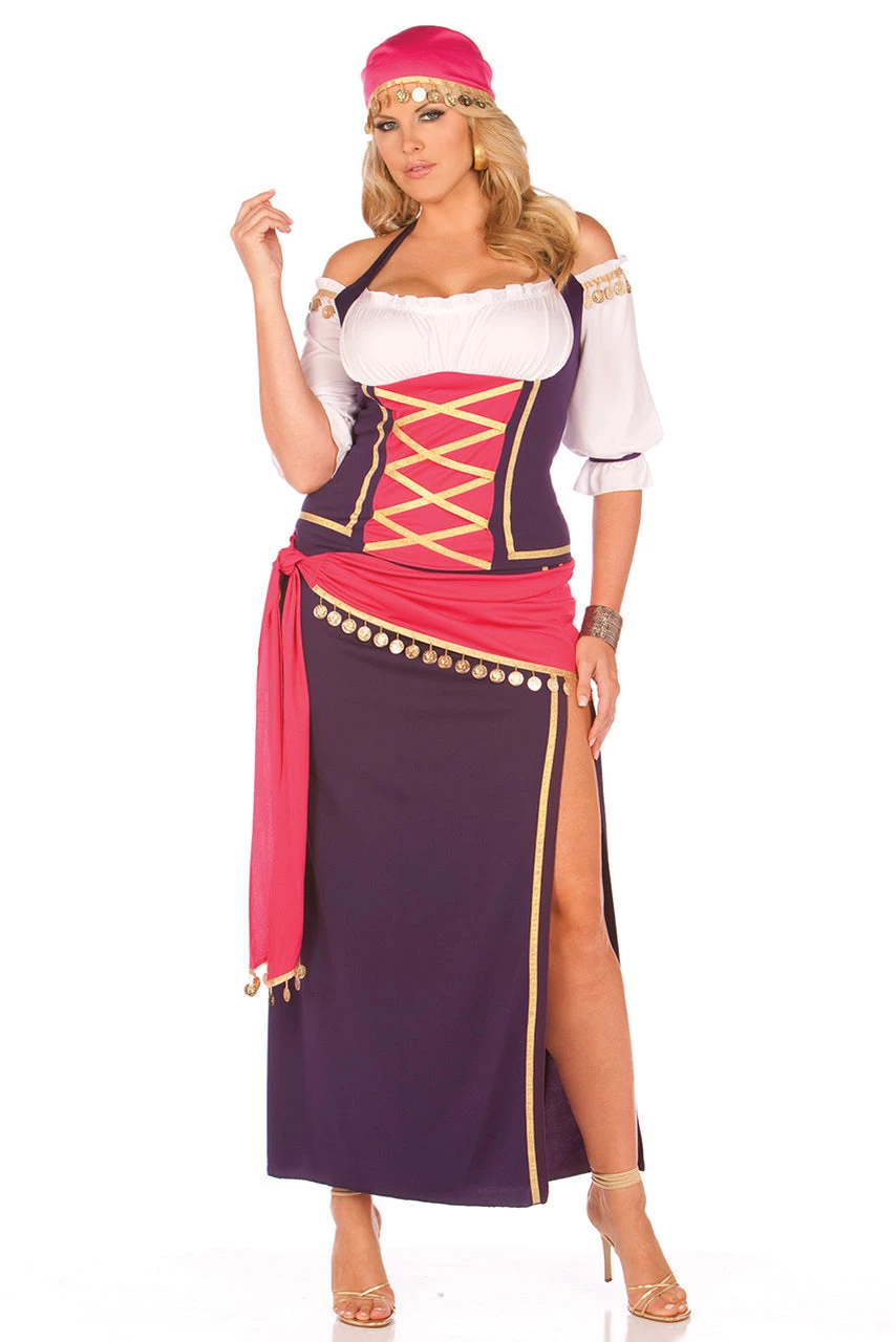 This plus size, Frisky Fortune Teller costume includes an off the shoulder dress with faux gold lace up front, a high side slit, halter neck, a sash with coin trim, head scarf, and bracelts.