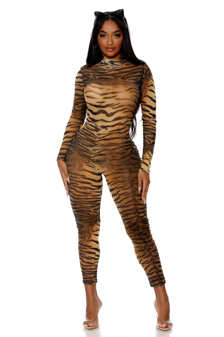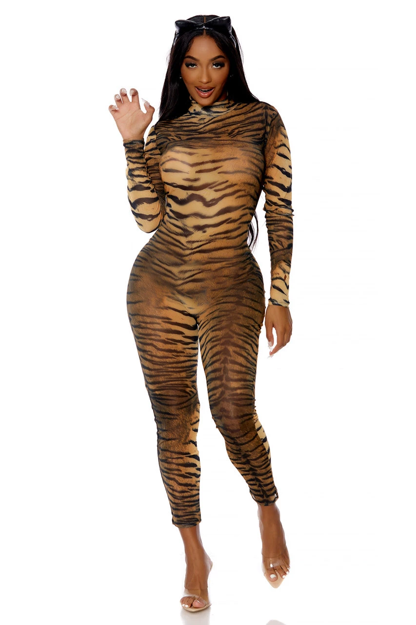 This two-piece, Can’t Be Tamed costume includes a tiger print jumpsuit with a mockneck, long sleeves, zip up back, and matching ear headband.