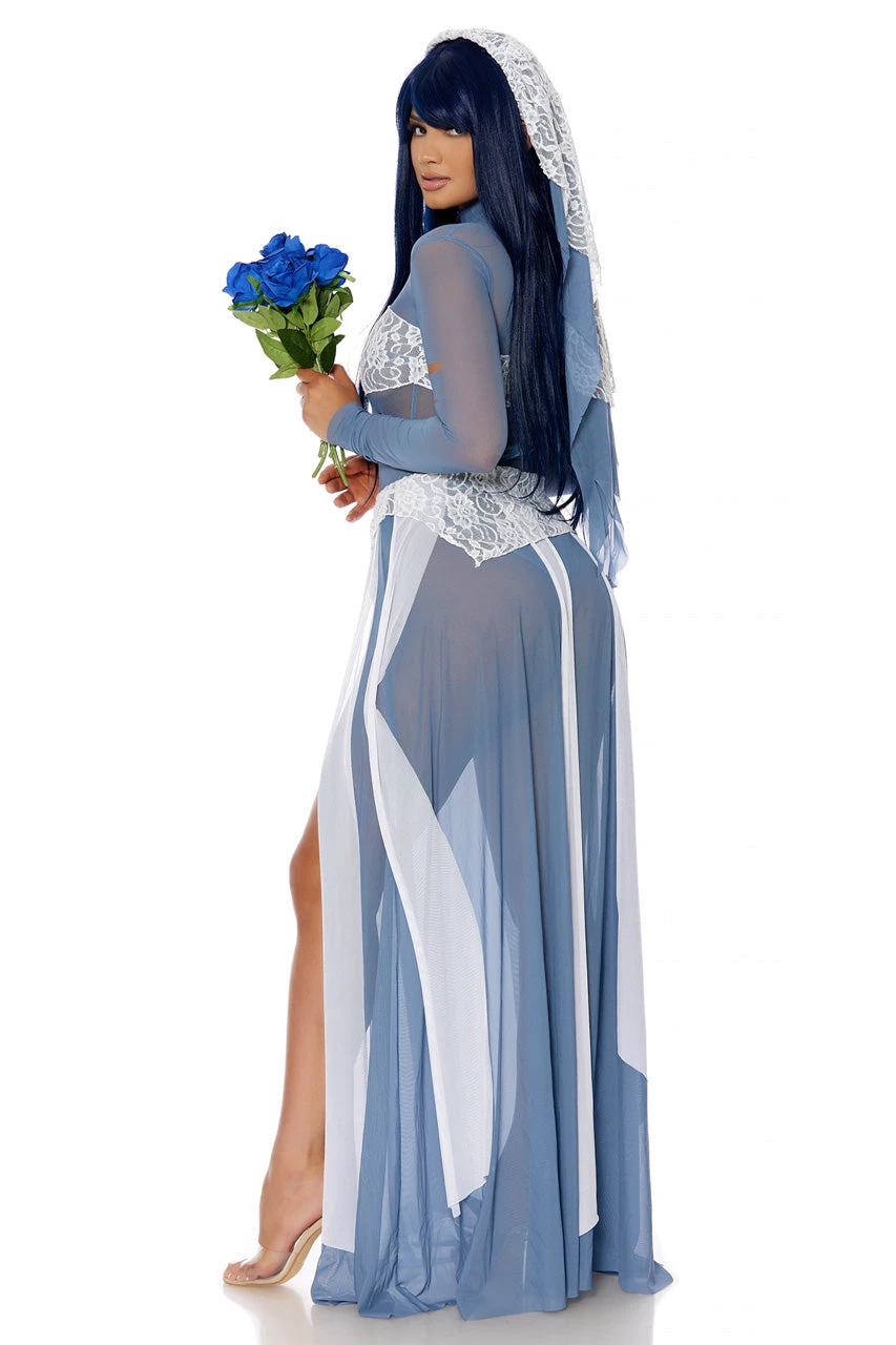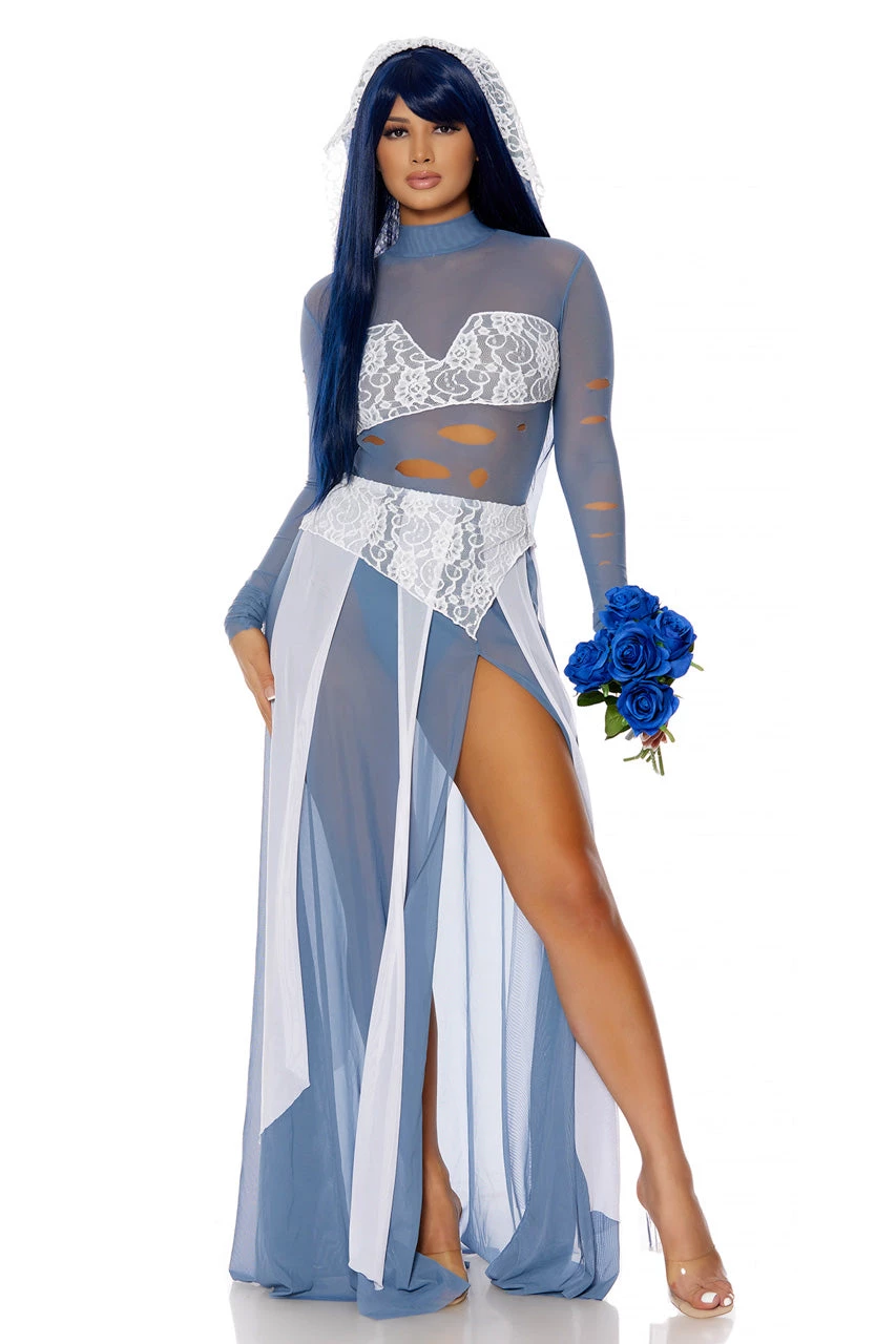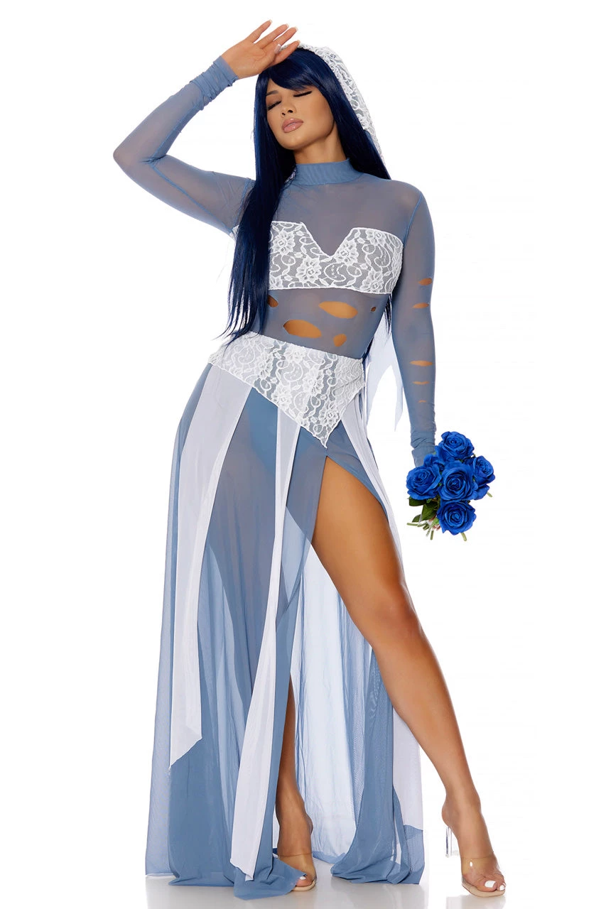 This four-piece, Death Do Us Part costume includes a blue mesh, mockneck bodysuit with long sleeves, lace panels, a matching high slit skirt, a lace veil, and faux rose bouquet.