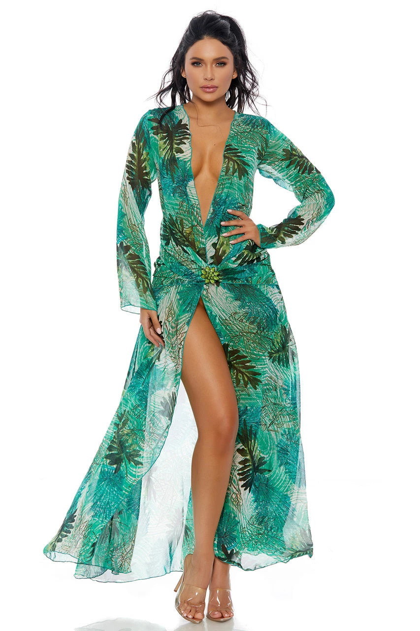 This Love Don’t Cost a Thing Superstar costume includes a sheer mesh dress with long sleeves, a plunging neckline and a high front slit.