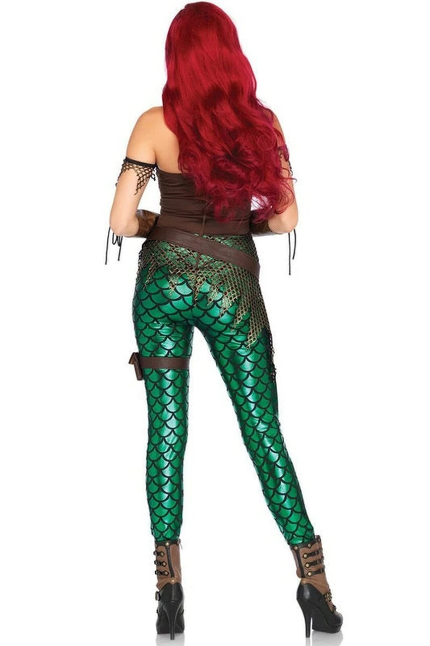 This Mermaid Costume is so Badass that she even has feet. Costume features a sexy mermaid catsuit with scale leggings and a faux leather top. Paired with a hip hugging belt and garter. They won’t dare call you little anymore.