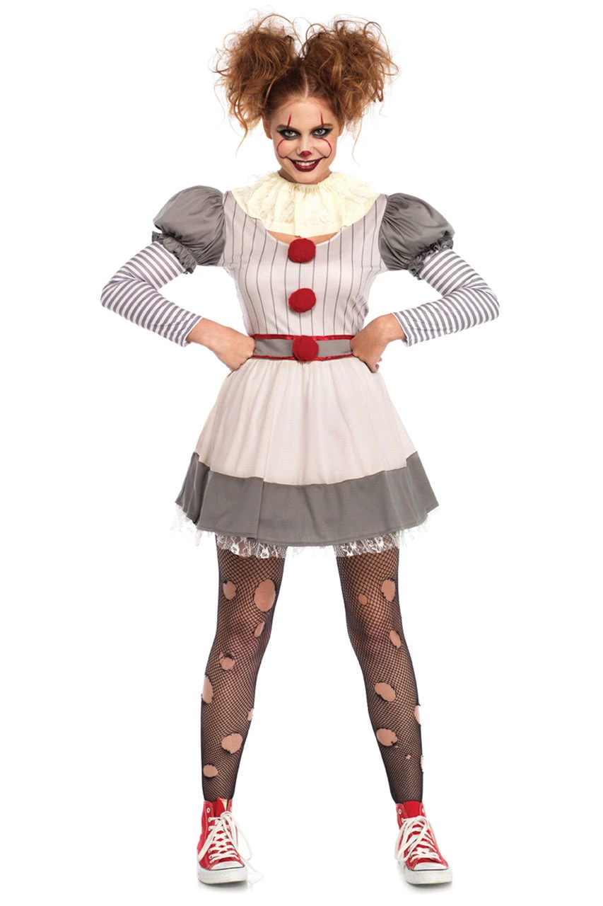 This two-piece, Creepy Clown costume includes a striped clown dress with pom pom details, puff sleeves and a lace neck piece.