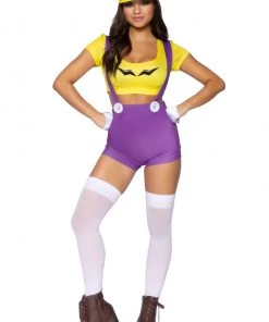 This three-piece, Gamer Villain costume includes a yellow character crop top, purple suspender shorts with icon accents, and a matching purple hat. (Gloves and stockings not included.)