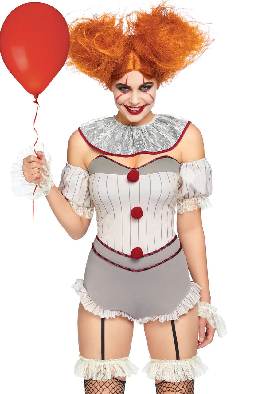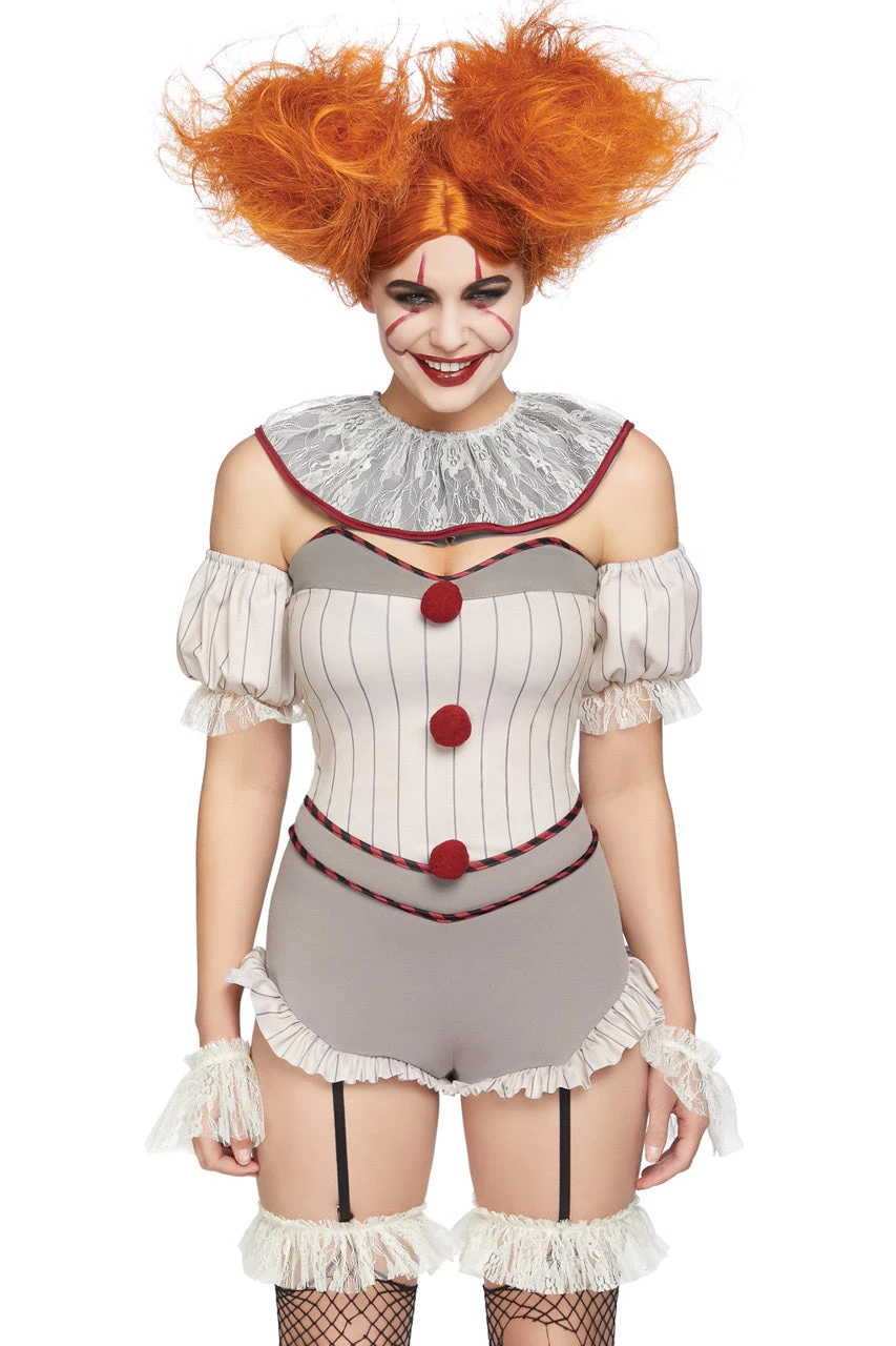 This four-piece, Killer Sewer Clown costume includes a grey romper with attached garter straps, ruffle trim, a striped bodice, red pom pom appliques, clear removable straps, arm puffs, neck collar and wrist cuffs. (Stockings not included.)