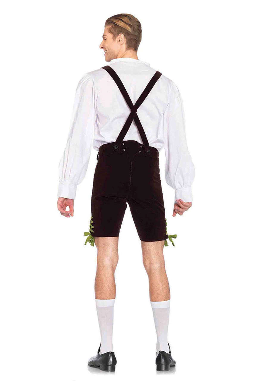 This three-piece Men’s Lederhosen costume includes a velveteen lederhosen with bib suspenders and a white shirt.