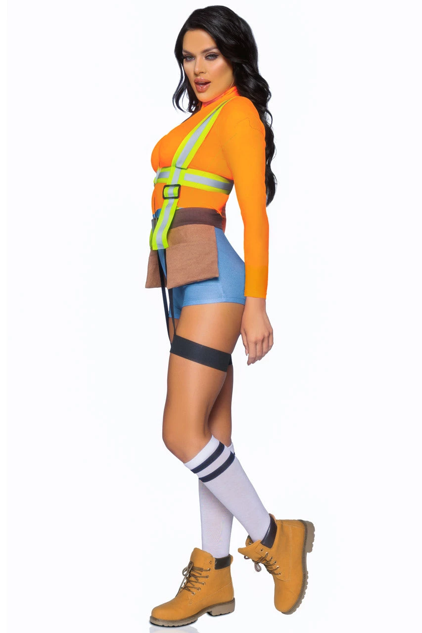 This two-piece, Nailed It Construction Worker costume includes a blue and orange romper with long sleeves, a zip up front, and a reflective harness with tool pockets. (Tools not included.)