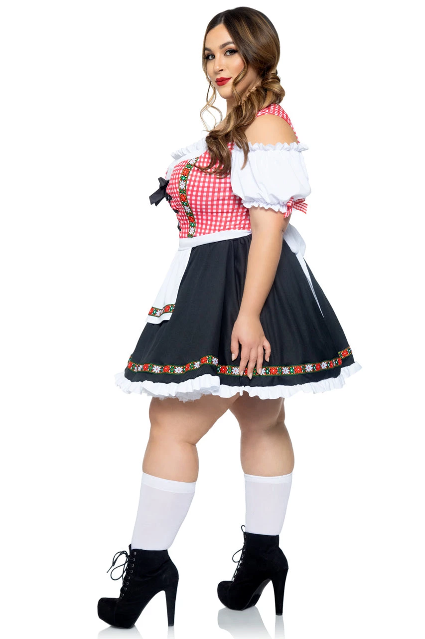Be one hot bavarian beauty in this plus size, Beer Garden Girl costume featuring a gingham print peasant dress with lace-up details, cold shoulder cut outs, attached apron and printed trim details. (Beer stein, petticoat and stockings not included.)