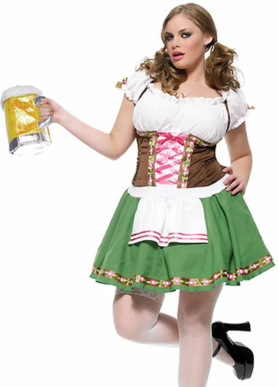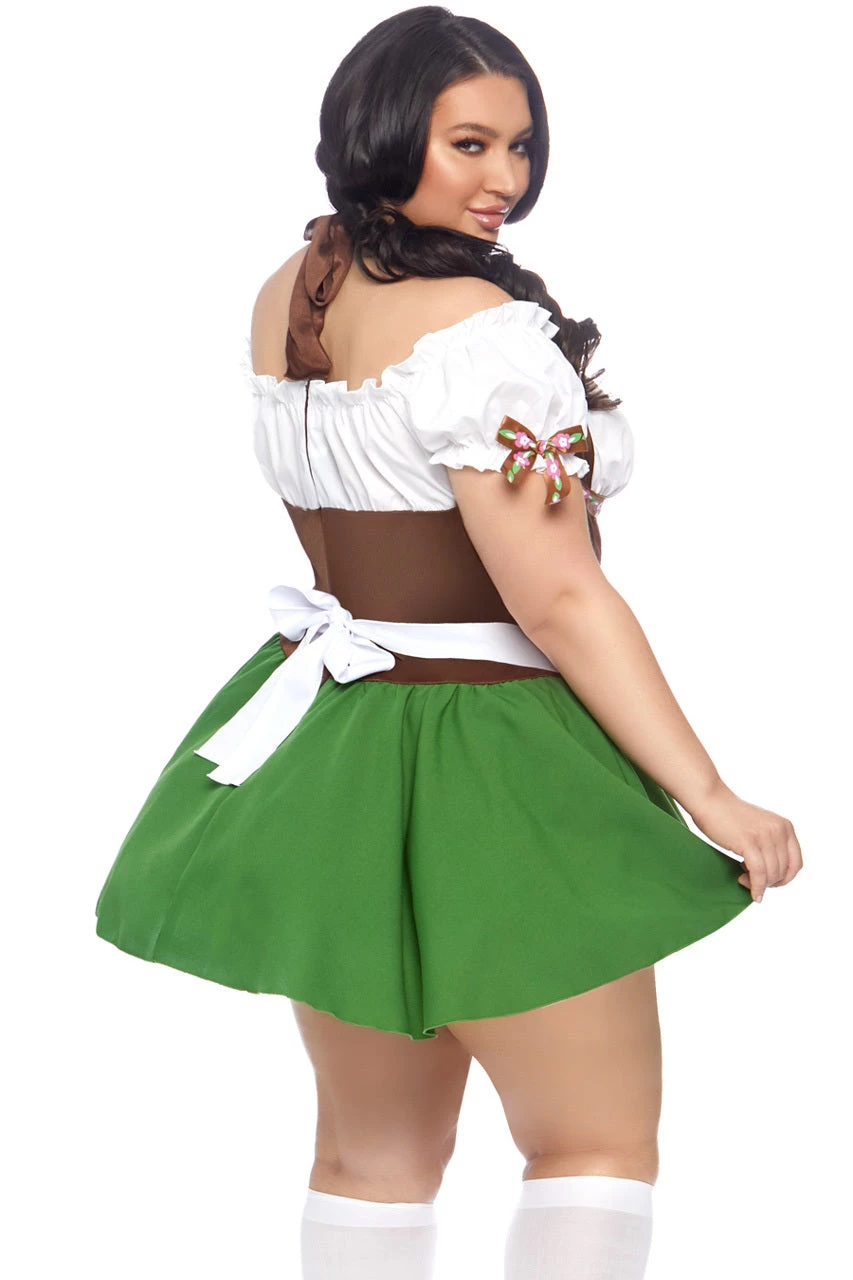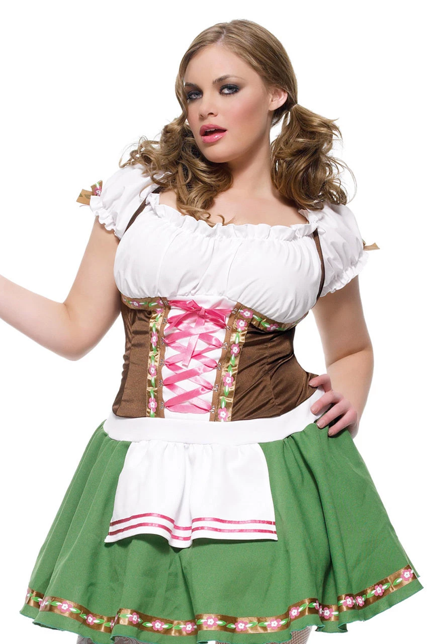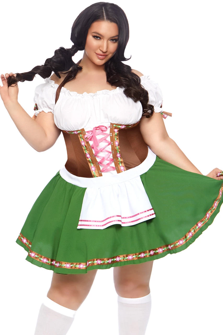 Pour a pint in this plus size Beer Girl Gretchen costume featuring a mini dress with a peasant-style top, a criss cross bodice, a green skirted bottom with an attached apron and satin trim and matching bows. (Petticoat, stockings and beer mug purse not included.)