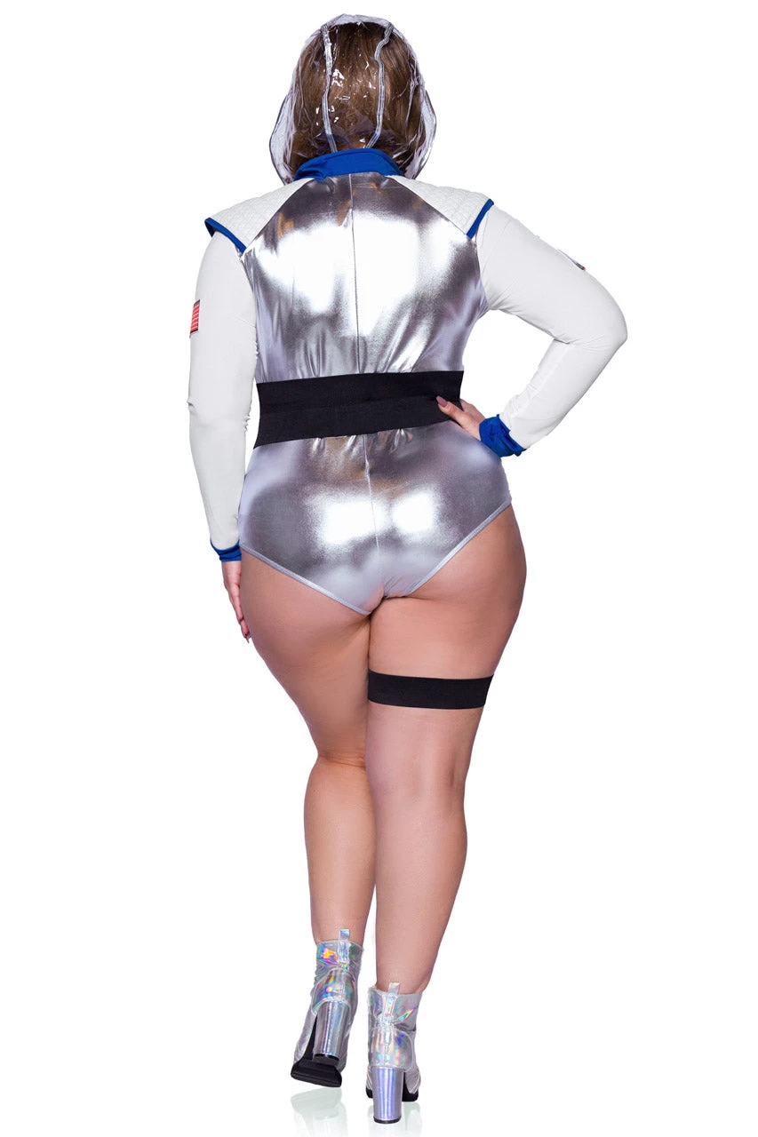 This three-piece, plus size Galaxy Girl costume includes a lame’ zipper front bodysuit with a body harness, patch accents, belt with attached leg garter, and detachable clear hood. (Ray gun not included)