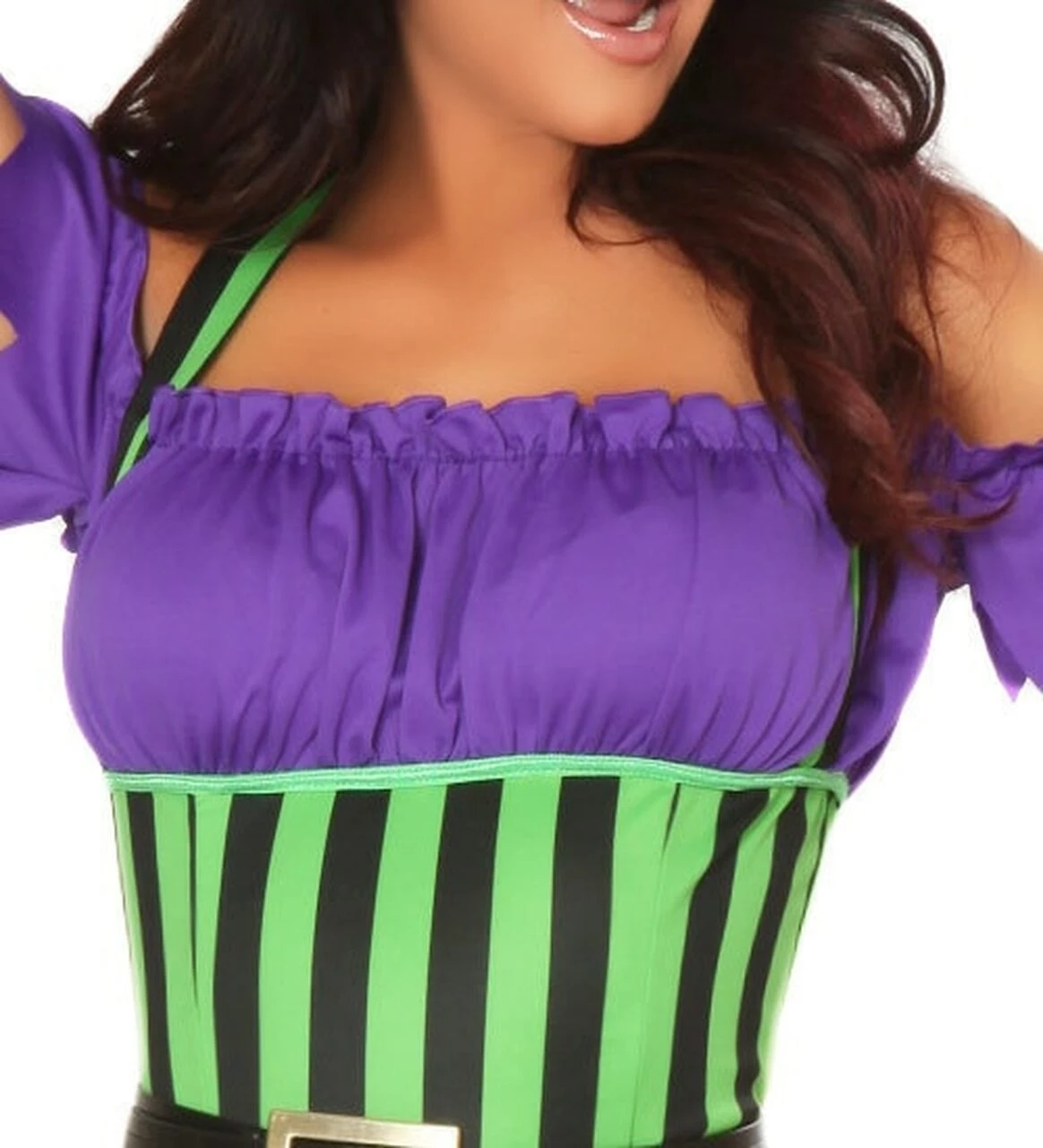 Three Piece Spell Binding Witch Costume includes Off the Shoulder Garter Dress, Belt and Matching Hat.Â