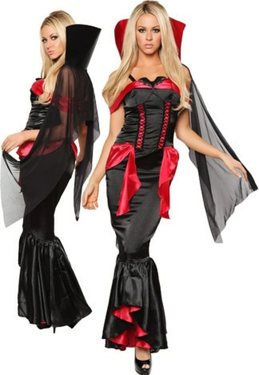 2 Piece Sexy Vampire Costume for Women includes Long Satin Dress and Cape.