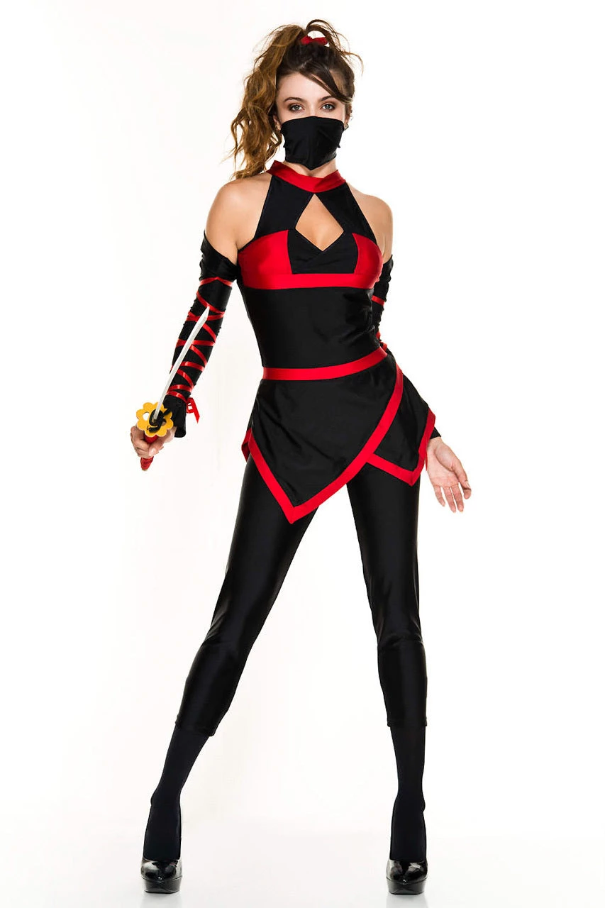 This six-piece Walker of Shadows Ninja costume includes a black mini dress with an asymmetrical hemline, red trim, high cut neck with a cut out bust, face mask hair tie, arm warmers, lace-up ribbons and leggings.