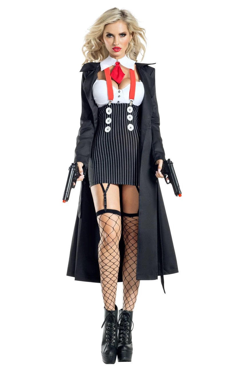 This Gangster Babe costume includes a black and white pinstripe mini dress with button details, a white top with padded cups, red suspenders, a black trench coat, and tie. (Stockings and toy guns not included.)