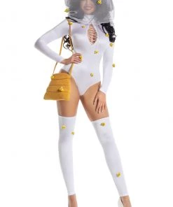 This honey bee Keeper costume includes a white lace up teddy with bee details, a lace-up bust, long sleeves, a mesh veil headpiece, leg warmers, and hive purse.