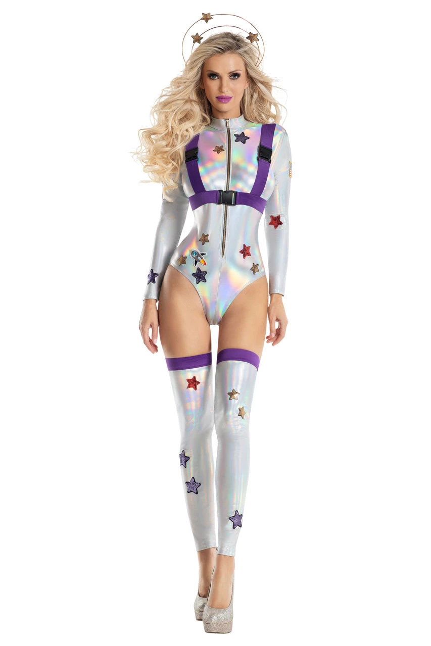 This Out of this World Astronaut costume includes an iridescent lamé bodysuit with a front zipper, long sleeves, star patches, purple elastic accents, inflatable “oxygen tank”, a matching headpiece, and leg warmers.