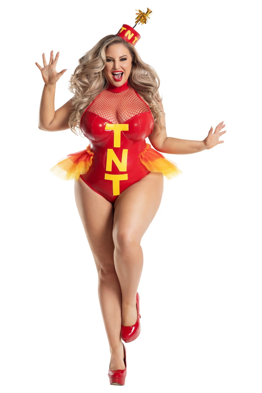 This plus size, Dynamite! costume includes a red vinyl teddy with a red, orange, and yellow tulle bustle, fishnet bust, halter neck, “TNT” print, and a matching “TNT” headpiece.