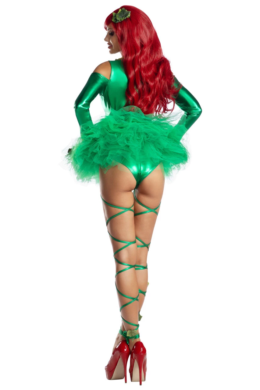This Poisonous Babe costume includes a green lamé bodysuit with green leaf appliques, a low cut front with lace-up detail, attached leg wraps, a ruffle tutu skirt, and a leaf hair clip. (Wig not included.)