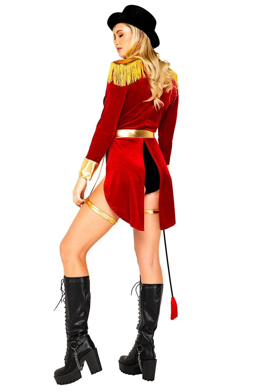 This four-piece, Big Top Mistress costume includes a red velvet bodysuit with chain detail, matching jacket with gold fringe epaulettes, gold bowtie, gold garter belt, and hat. (Crop not included.)