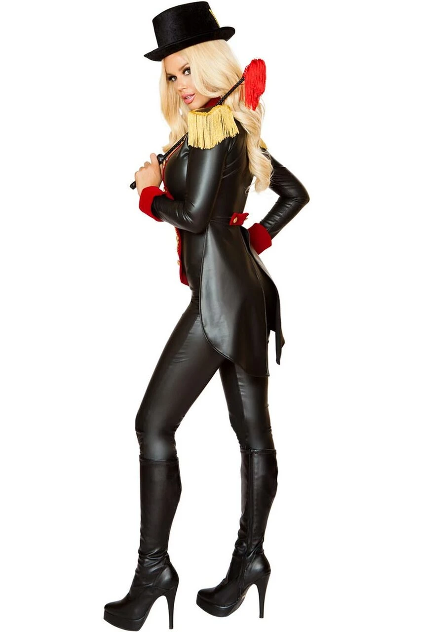 Get ready for center stage in this sexy one piece ringleader catsuit for women in seductive black with faux leather styling. The red cuffs and lapel, along with the mandarin collar add to the allure. An attached black jacket tail, gold button detailing, and gold chain accents complete the look. This sexy floor-length, long-sleeve catsuit hugs your body in all the right places to captivate every audience!