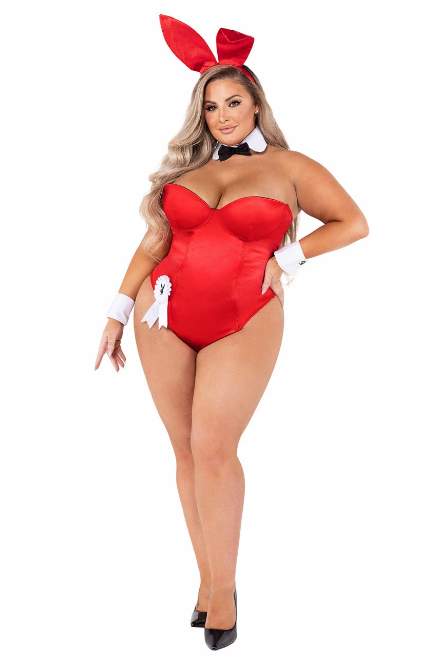 This eight-piece, plus size, Classic Playboy Bunny costume includes a satin, corset-style bodysuit with a strapless sweetheart bust, underwire cups, a zip up back, a cheeky cut bottom, high cut hips, attached cottontail, a white ribbon with bunny print, wrist cuffs with Playboy cufflinks, a collar with attached bow tie, and matching bunny ears.