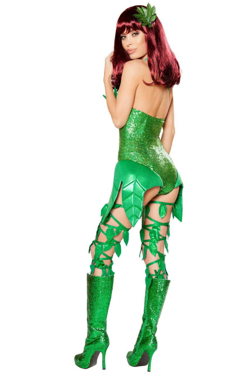This one-piece Poisonous Villain costume includes a green sequin bodysuit with padded leaf cups, padded leaf hip appliques, halter straps and a cheeky cut back. (Leg wraps and wig not included.)