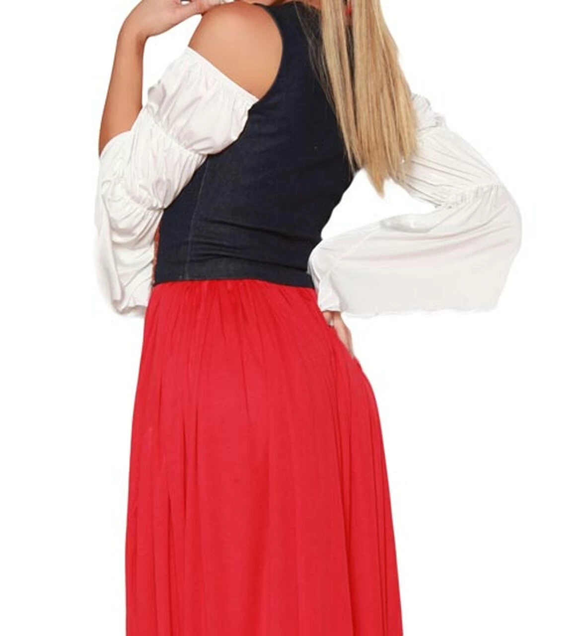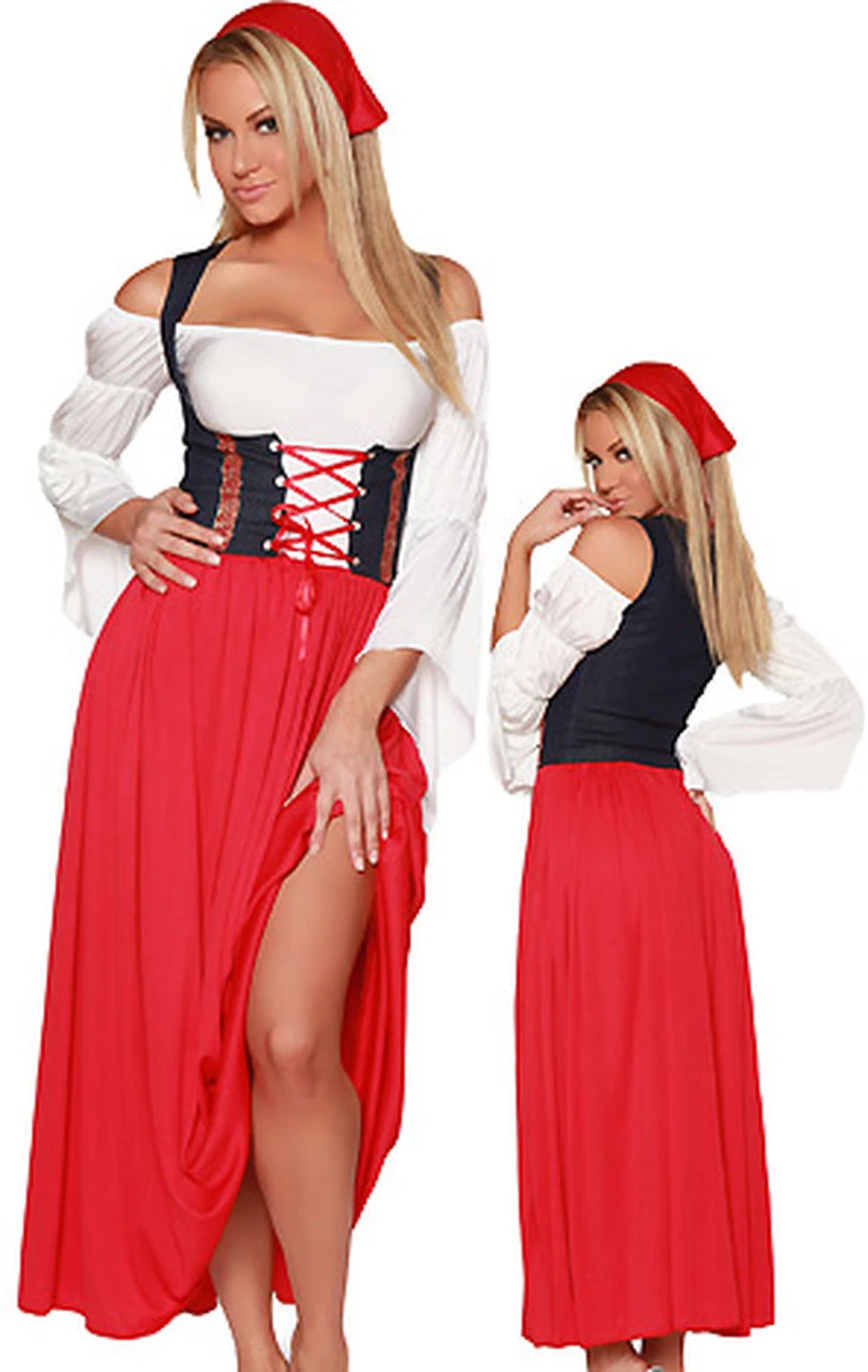 4 Piece Renaissance Maid Costume Includes Top, Skirt, Lace-Up Waist Cincher, and Head Scarf. Made in USAÂ