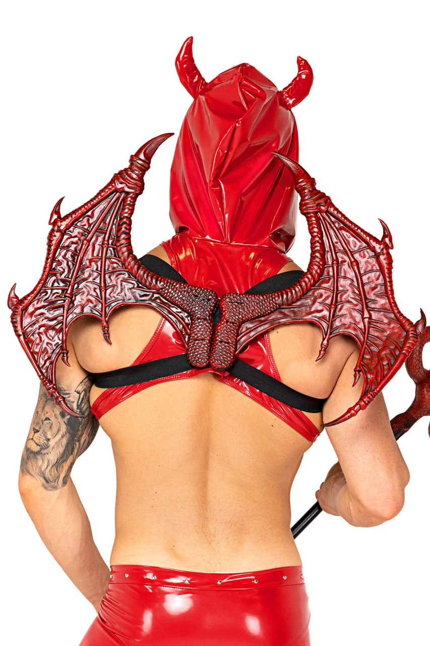 This two-piece, Lucivers Desire Devil costume includes a red harness with O-rings and studs, attached hood with devil horns, and red vinyl zip up trunks. (Wings not included.)