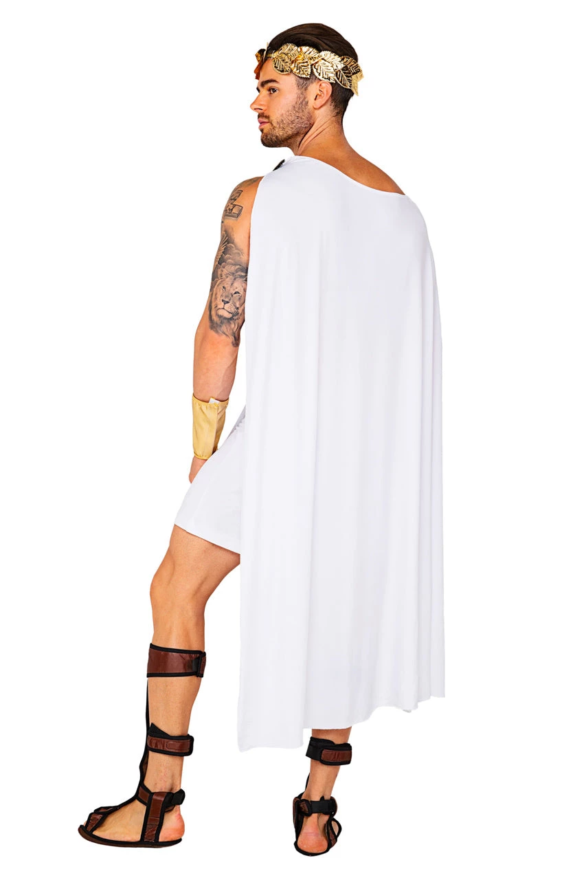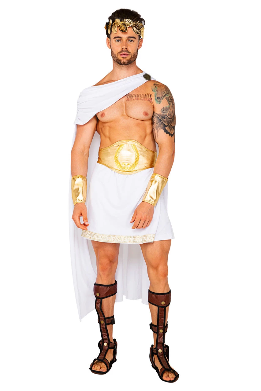 This four-piece, Olympian God costume includes a skirted tunic, gold belt, white draped cape, and gold wrist gauntlets. (Headpiece not included.)