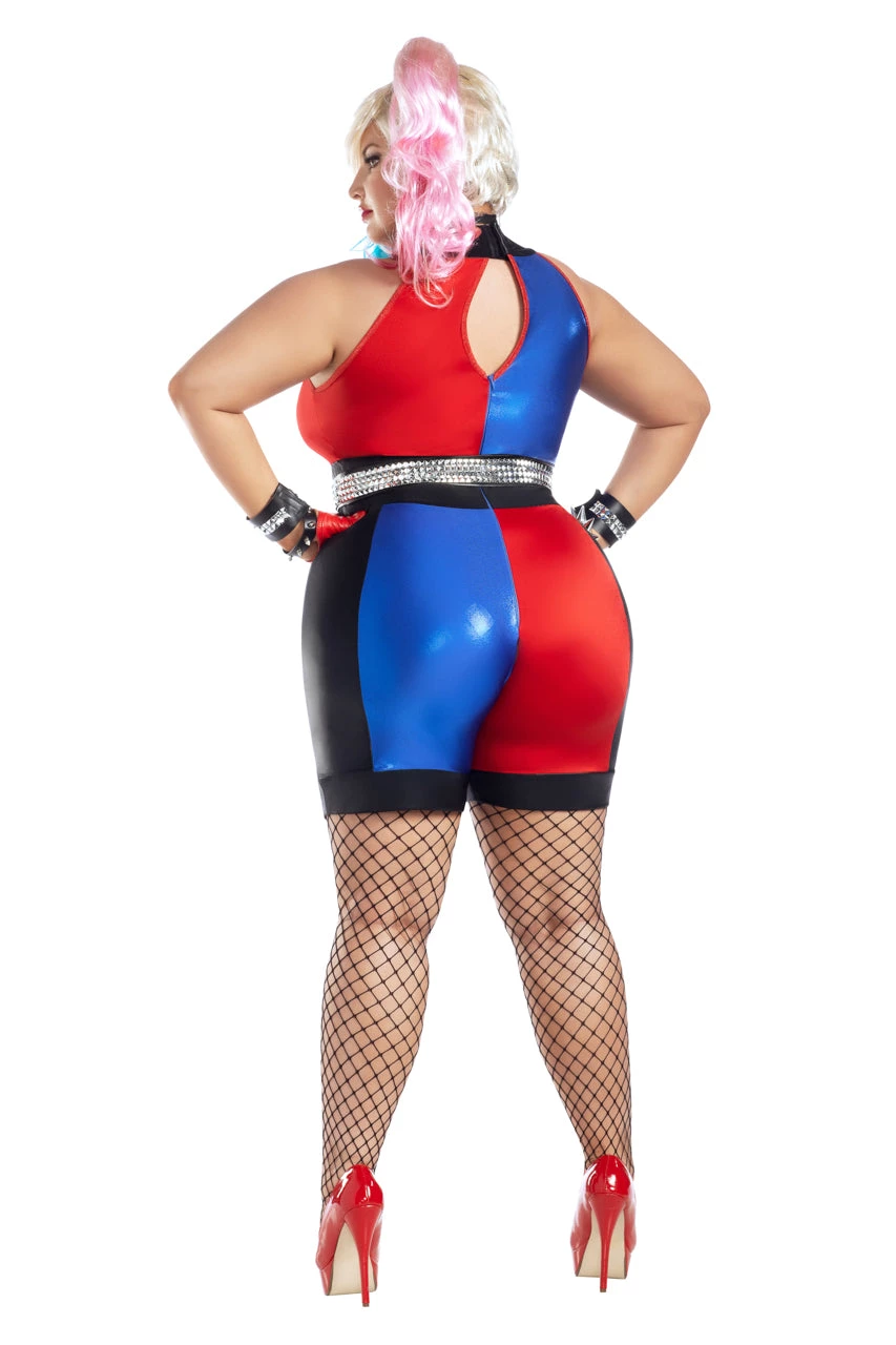 This plus size, Crazy Quinn costume includes a blue and red romper with a cut out bust, diamond appliques, a biker short-style bottom, a studded chain necklace, and studded bracelets. (Wig, gloves, and stockings not included.)